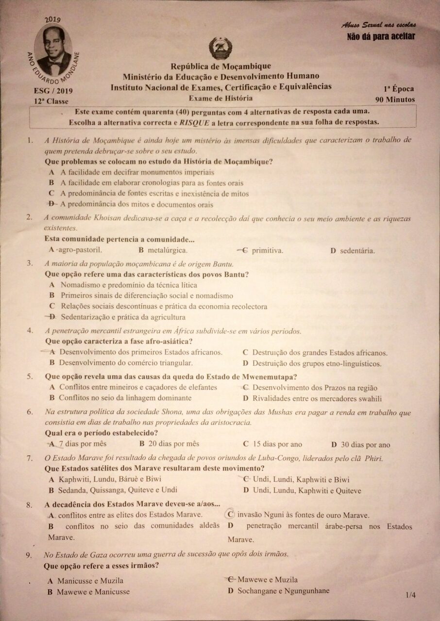 História 2019 – 1ª Chamada da 12ª classe (Enunciado do Exame em PDF)