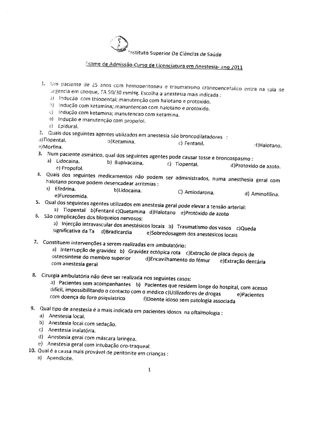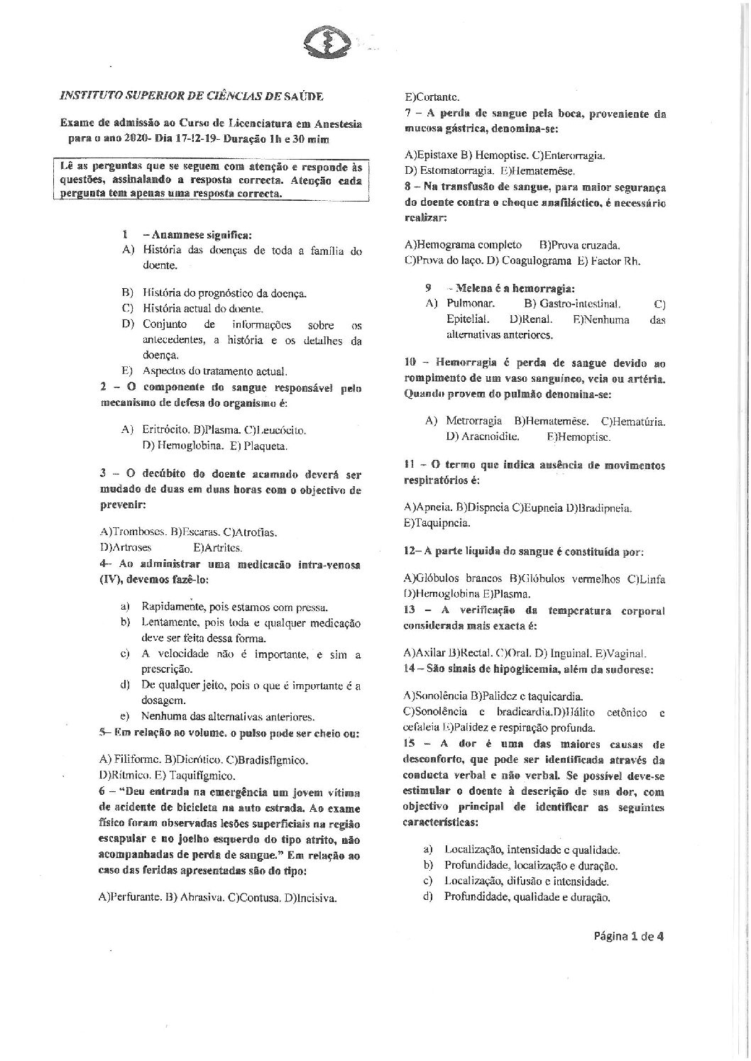 Anestesia – 2019 do ISCISA (Enunciado do Exame de Admissão – Saúde – em PDF) - Baixar este documento (Exame anterior - Moçambique)...
