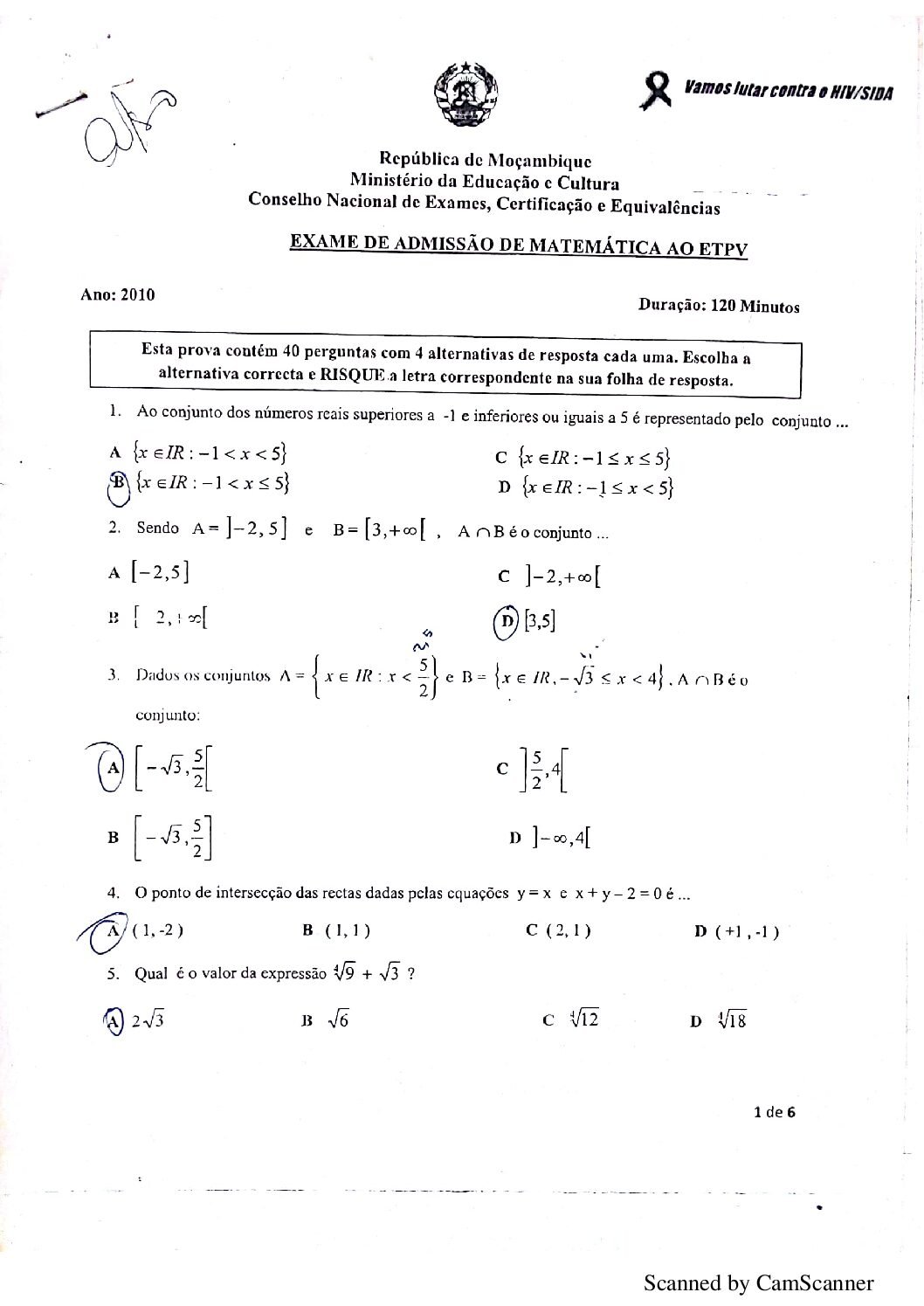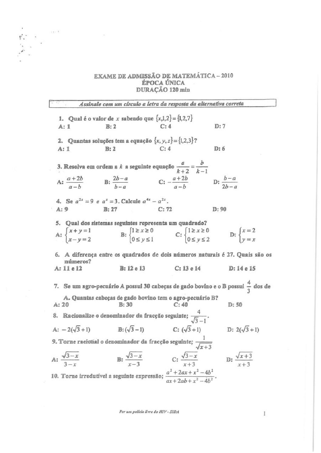 Matemática – 2010 do ETP (Enunciado do Exame de Admissão em PDF). Baixe grátis em formato PDF para estudo e preparação....