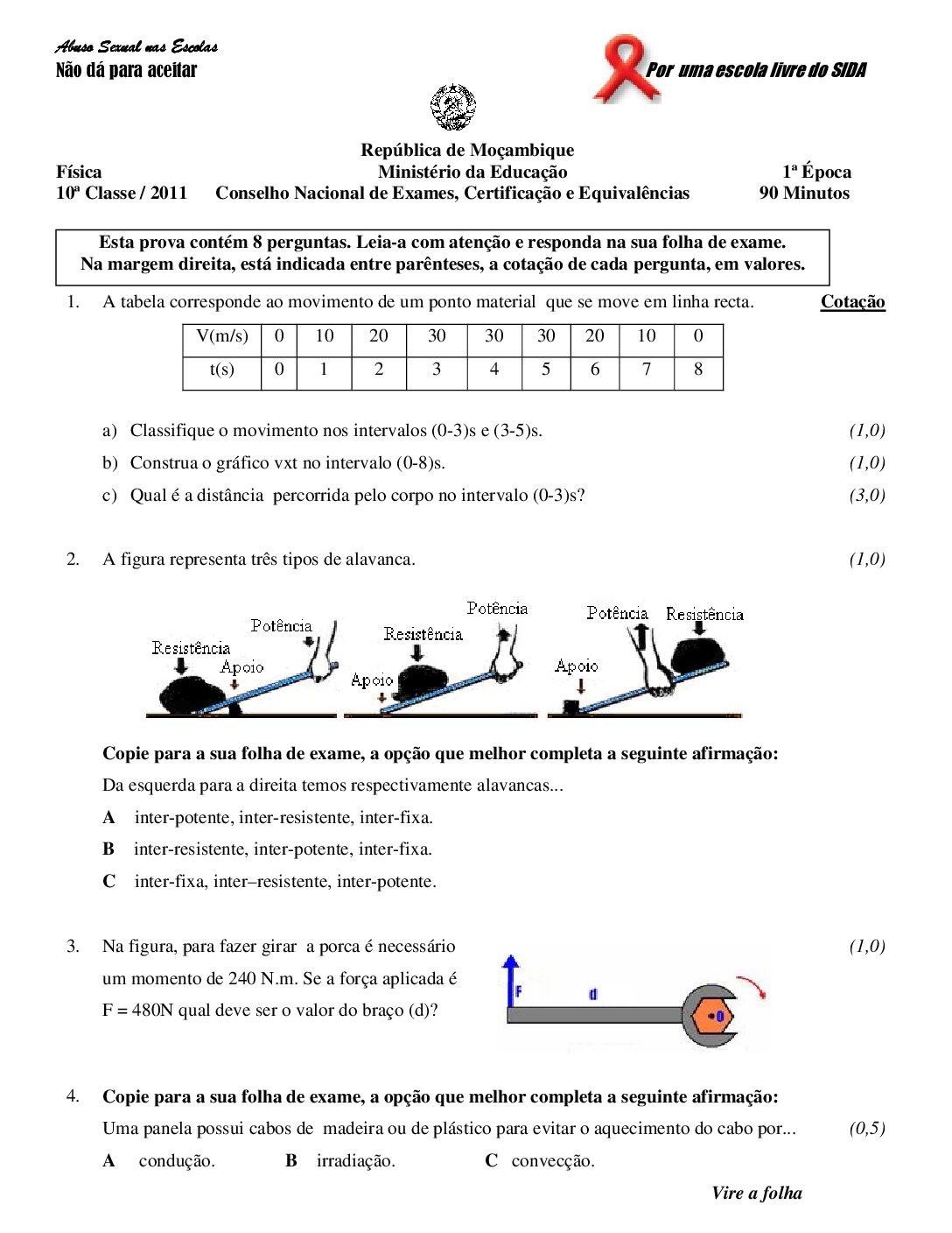 Física 2011 – 1ª Chamada da 10ª classe (Enunciado do Exame em PDF) - Baixar este documento, de forma simples, segura e grátis,...