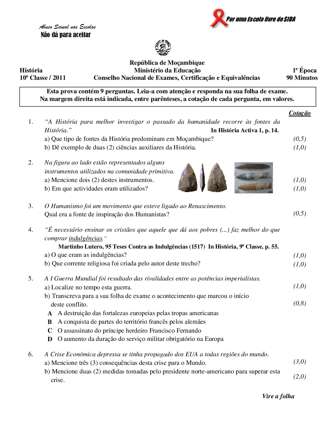 História 2011 – 1ª Chamada da 10ª classe (Enunciado do Exame em PDF)