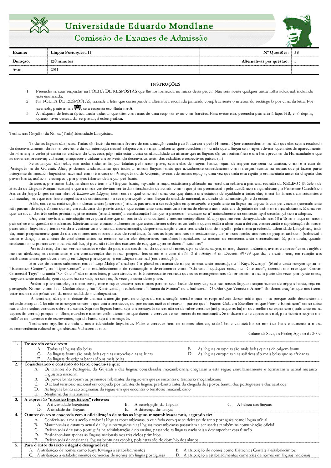 Português II – 2011 da UEM (Enunciado do Exame em PDF)