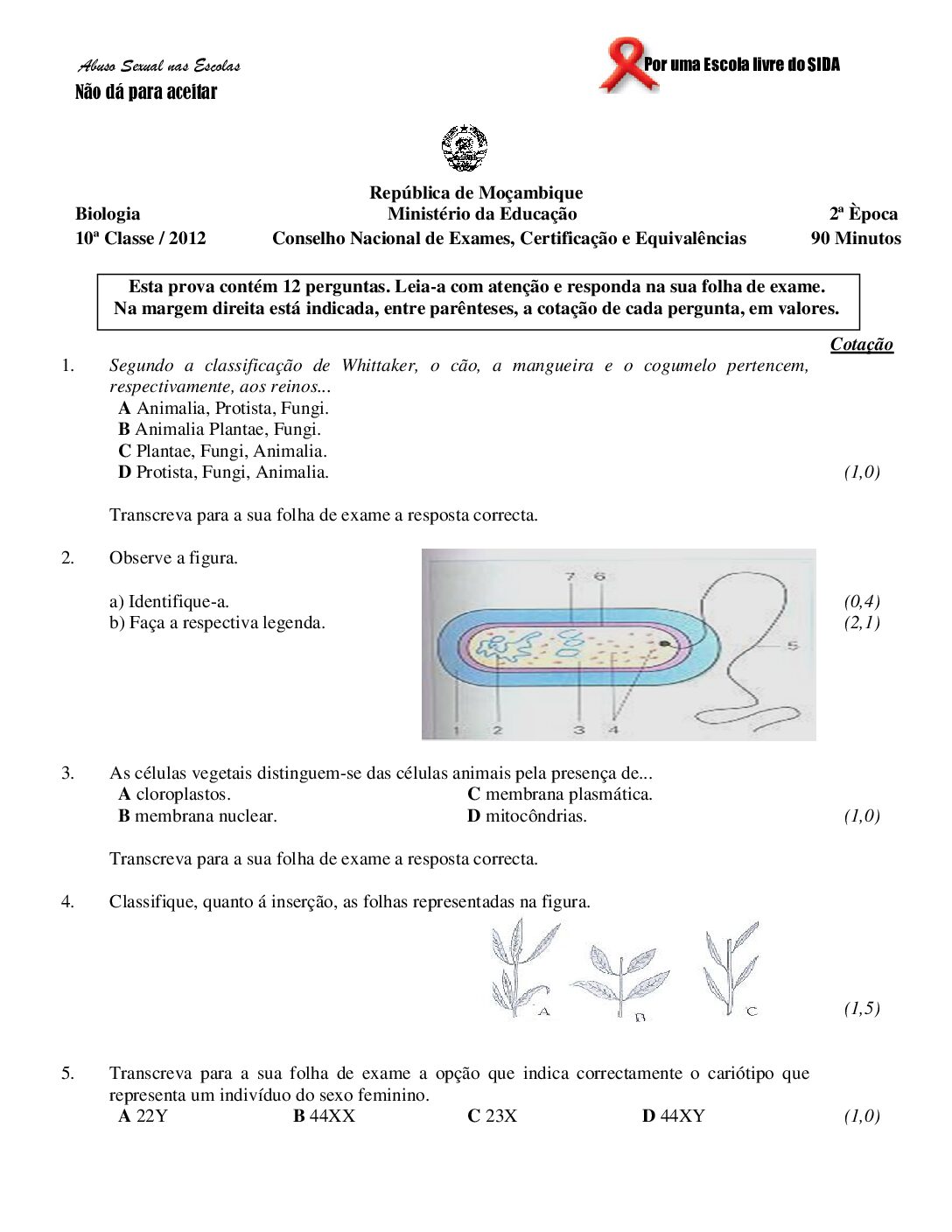 Biologia 2012 – 2ª Chamada da 10ª classe (Enunciado do Exame em PDF)