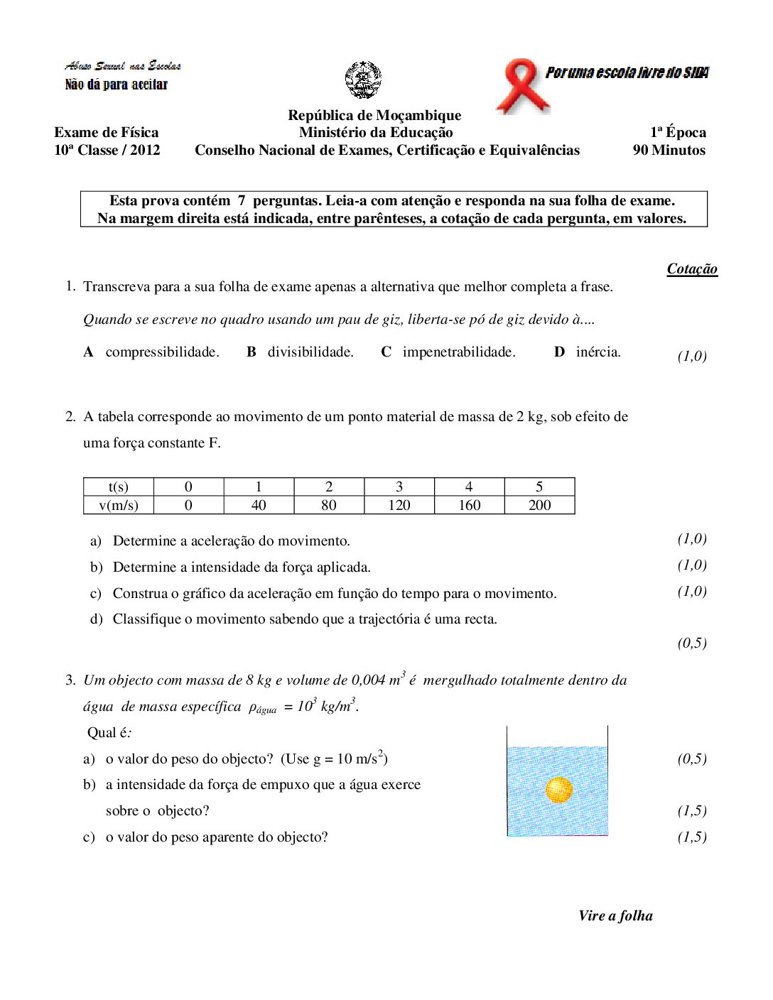Física 2012 – 1ª Chamada da 10ª classe (Enunciado do Exame em PDF) - Baixar este documento, de forma simples, segura e grátis,...