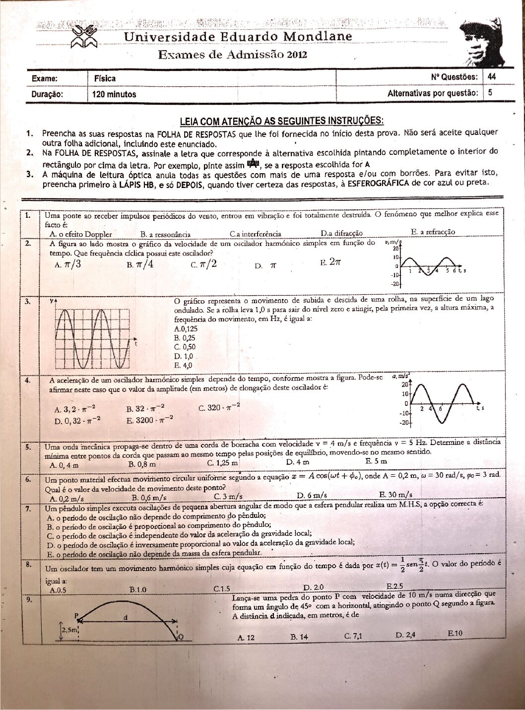 Física – 2012 da UEM (Enunciado do Exame Em PDF)