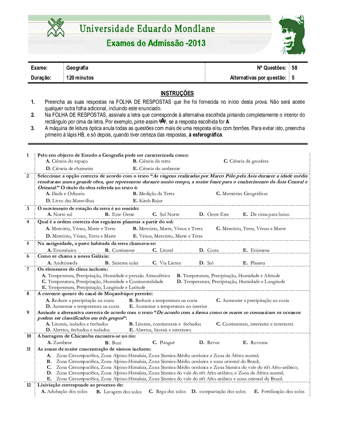 Geografia – 2013 da UEM (Enunciado do Exame Em PDF) - Baixar este documento em PDF para uso no seu ambiente académico...