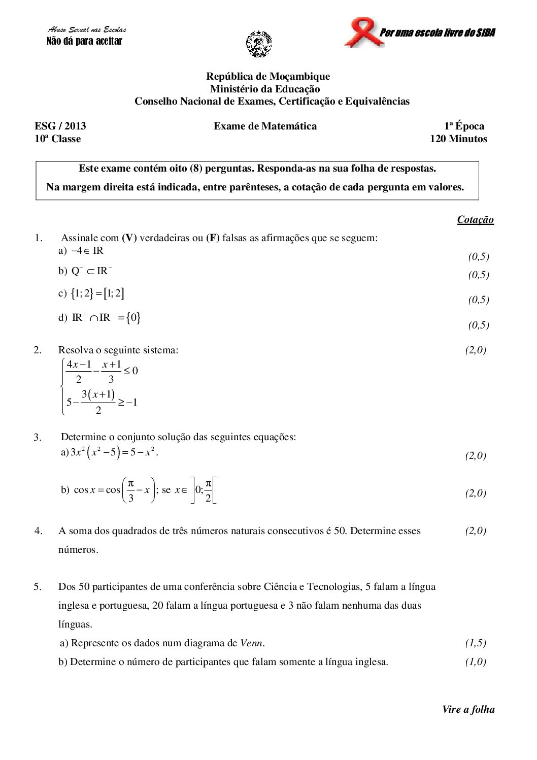Matemática 10ª classe 2013 – 1ª Época (Enunciado do Exame em PDF) - Baixar este documento em PDF para uso no seu ambiente...