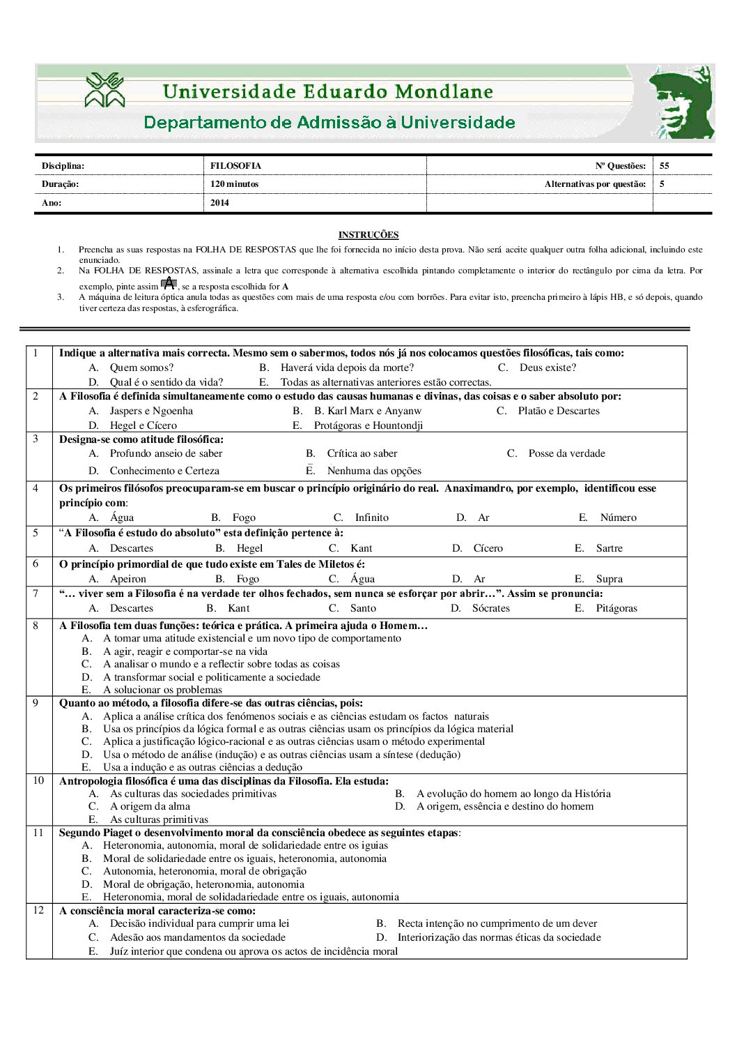 Filosofia – 2014 da UEM (Enunciado do Exame Em PDF) - Baixar este documento em PDF para uso no seu ambiente académico...