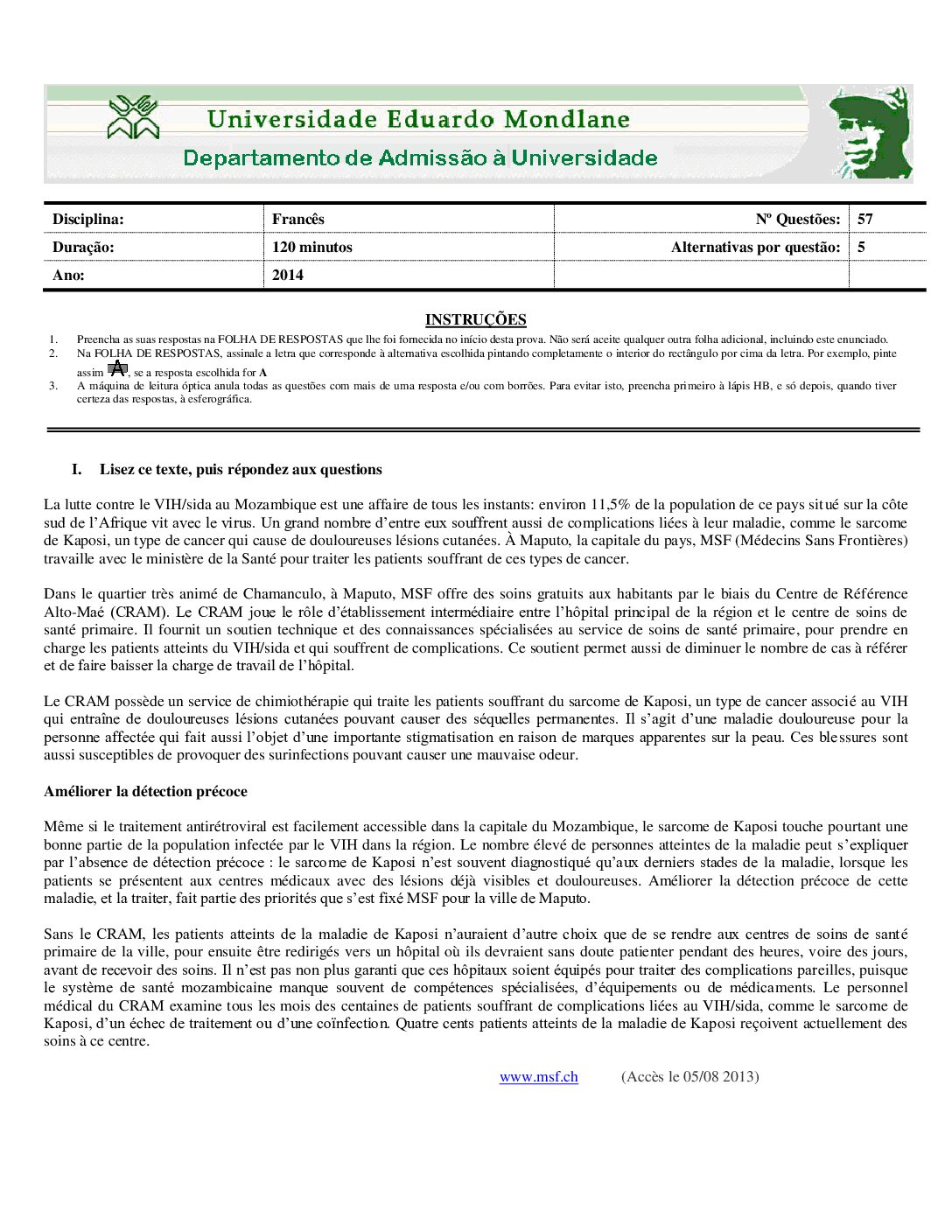 Francês – 2014 da UEM (Enunciado do Exame Em PDF) - Baixar este documento em PDF para uso no seu ambiente académico...