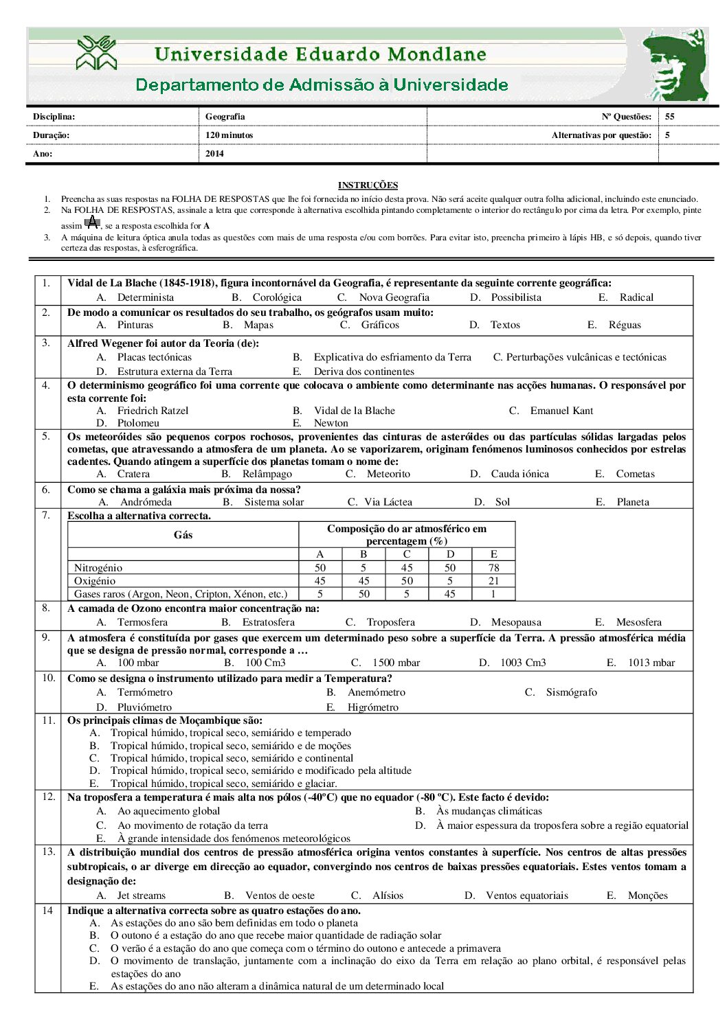 Geografia – 2014 da UEM (Enunciado do Exame Em PDF) - Baixar este documento em PDF para uso no seu ambiente académico...