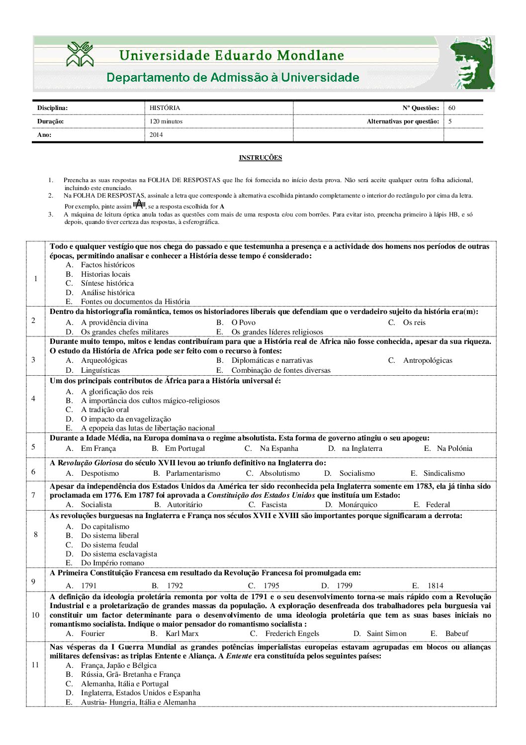 História – 2014 da UEM (Enunciado do Exame Em PDF) - Baixar este documento em PDF para uso no seu ambiente académico...