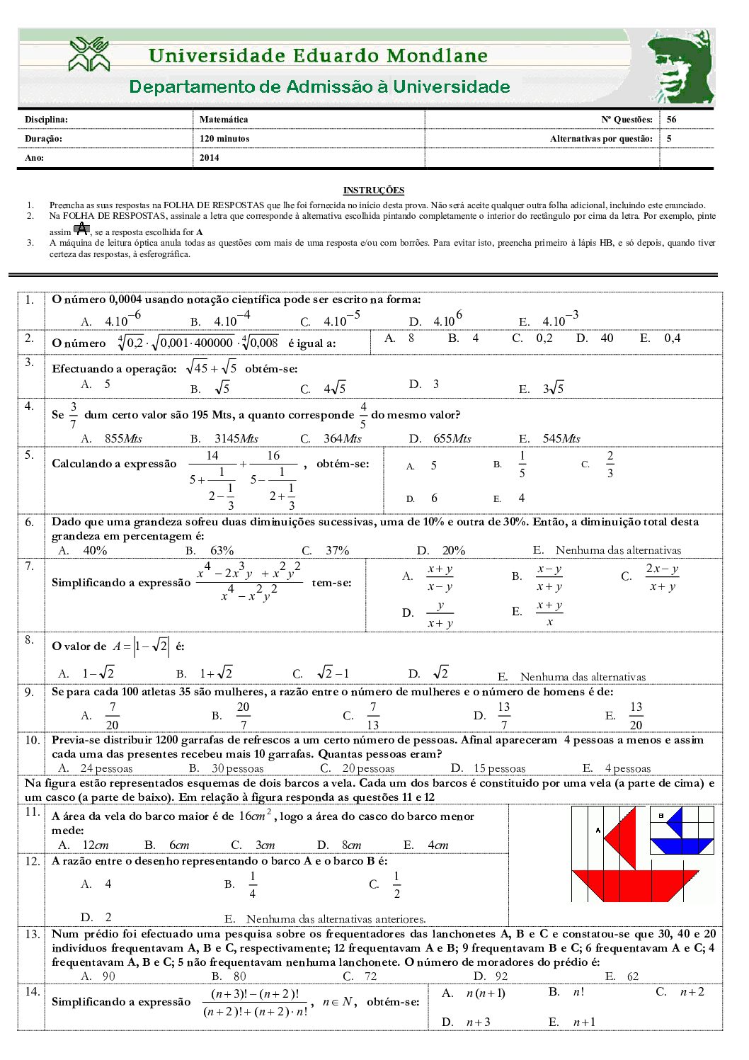 Matemática I – 2014 da UEM (Enunciado do Exame Em PDF)