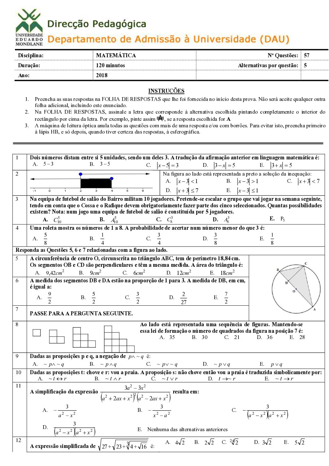 Matemática I – 2018 da UEM (Enunciado do Exame em PDF)