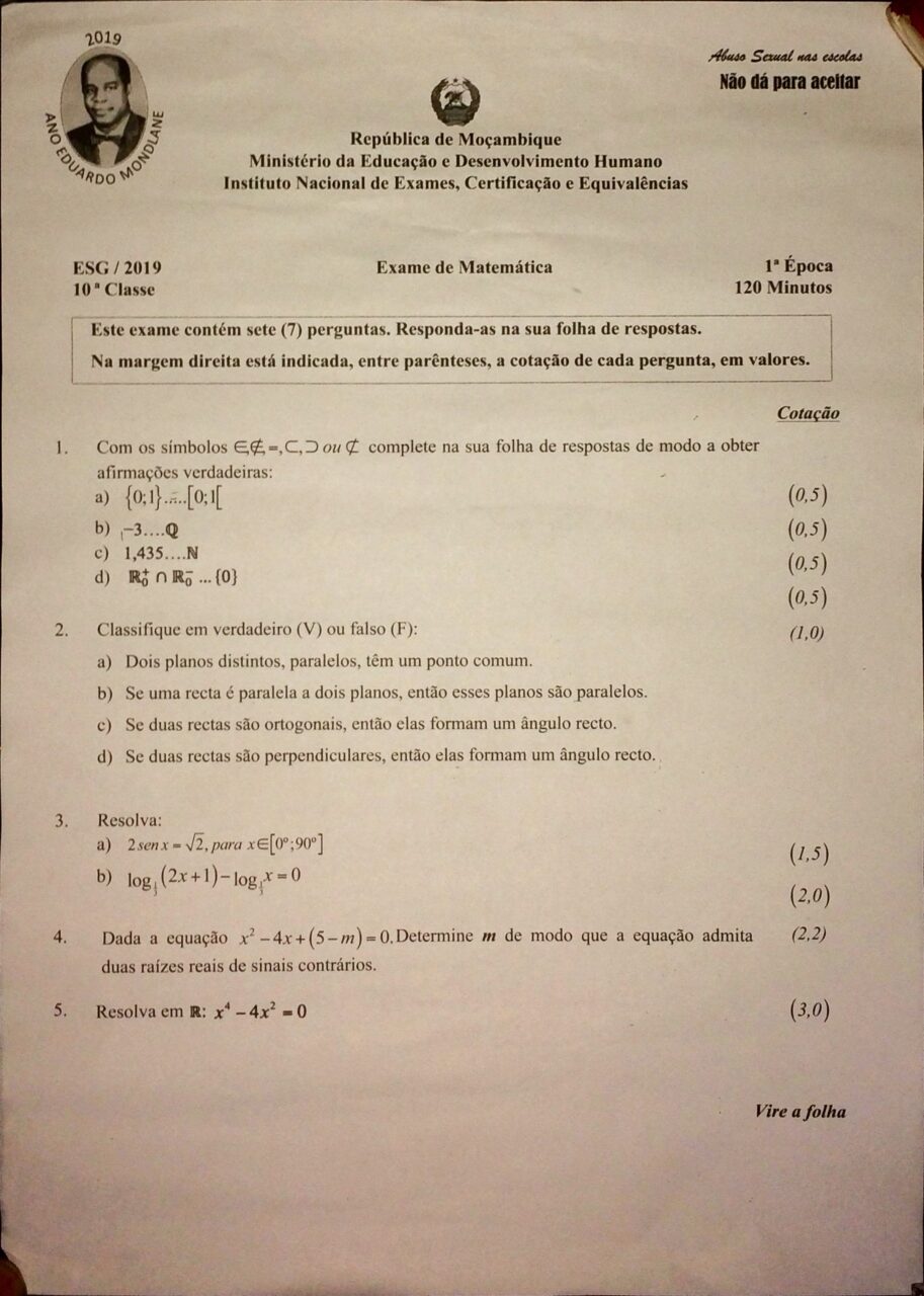 Matemática 10ª classe 2019 – 1ª Época (Enunciado do Exame em PDF)