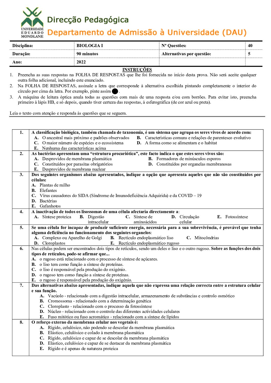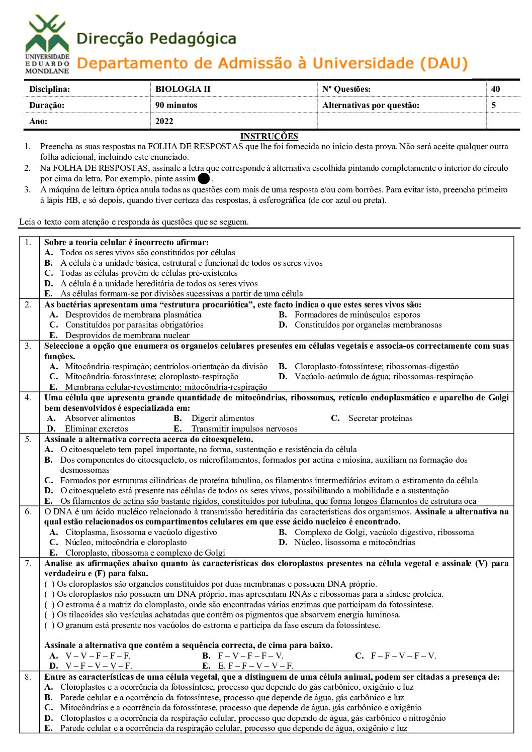 Biologia I – 2022 da UEM (Enunciado do Exame em PDF) - Baixar este documento em PDF para uso no seu ambiente académico...