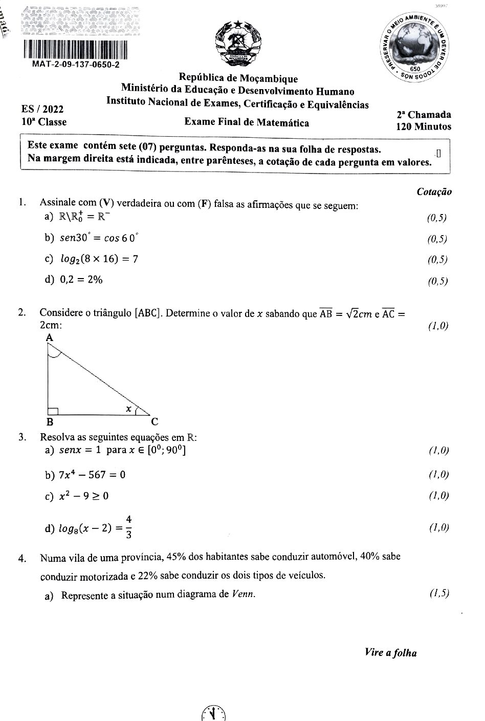 Matemática 2022 – 2ª Chamada da 10ª classe (Enunciado do exame em PDF)