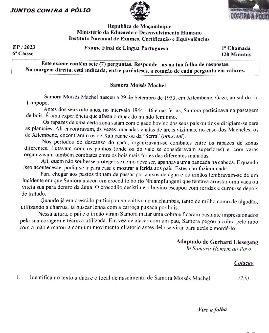 Português 2023 -1ª Chamada da 6ª Classe (Enunciado do Exame em PDF)