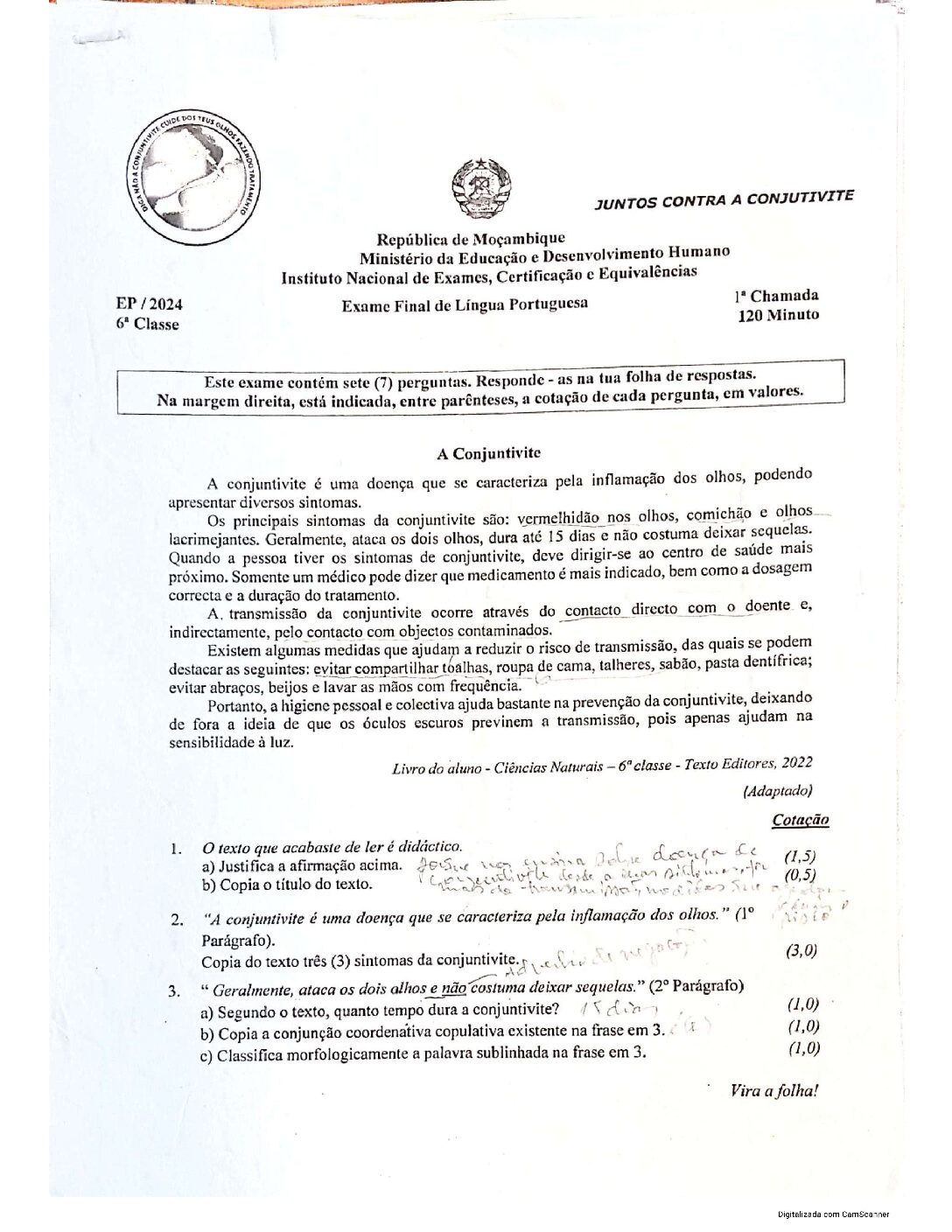 Português 2024 -1ª Chamada da 6ª Classe (Enunciado do Exame em PDF)