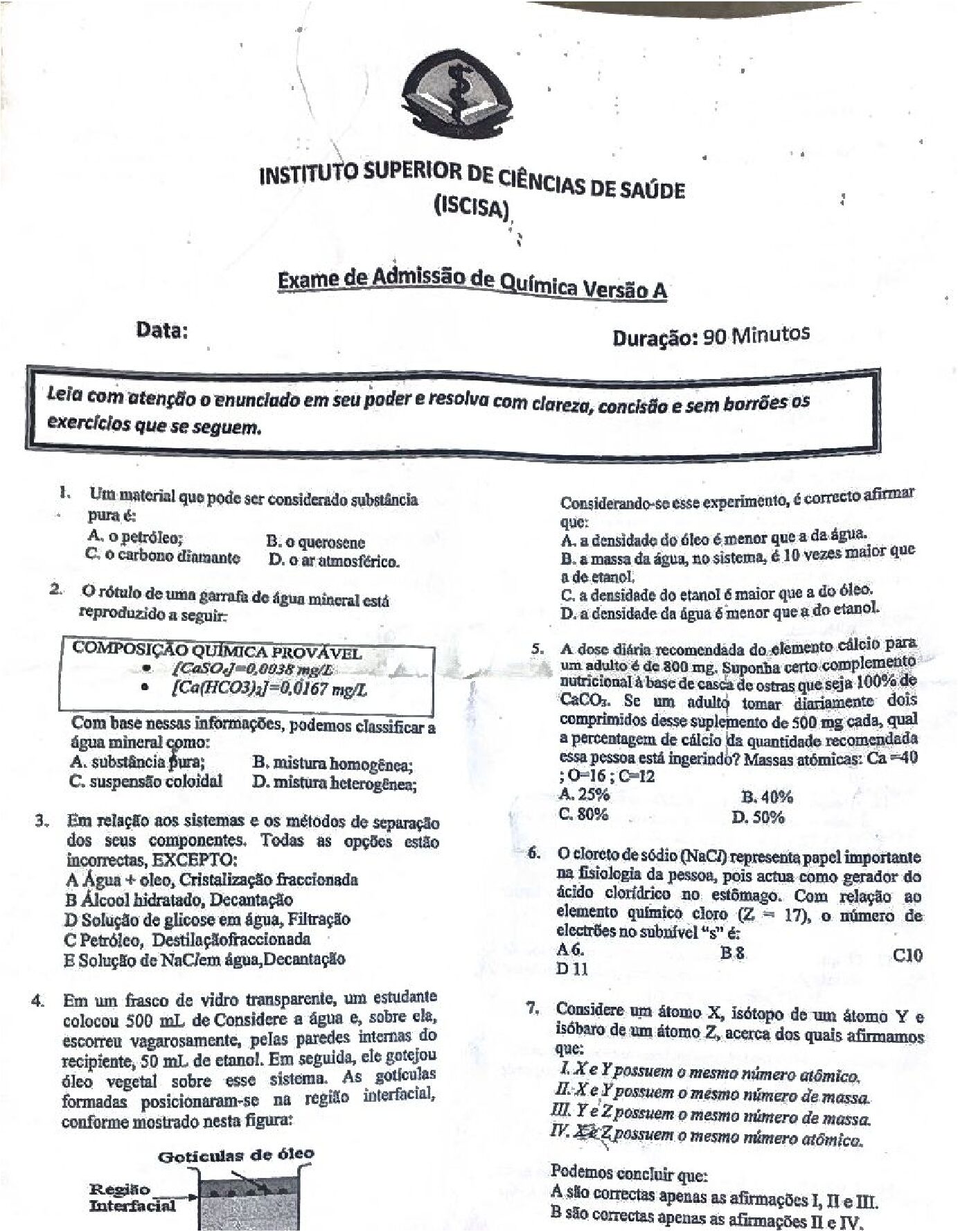 Química – 2025 do ISCISA (Enunciado do Exame de Admissão – Saúde – em PDF) - Baixar este documento (Exame anterior - Moçambique)...