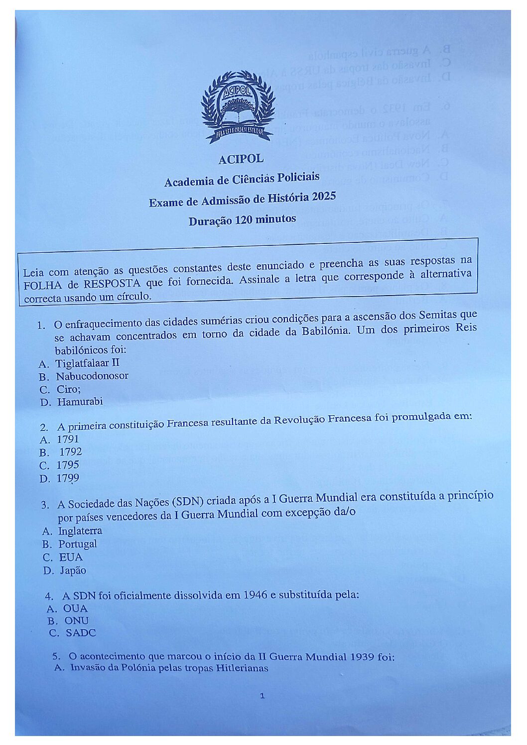 História – 2025 da ACIPOL (Enunciado do Exame de Admissão em PDF)