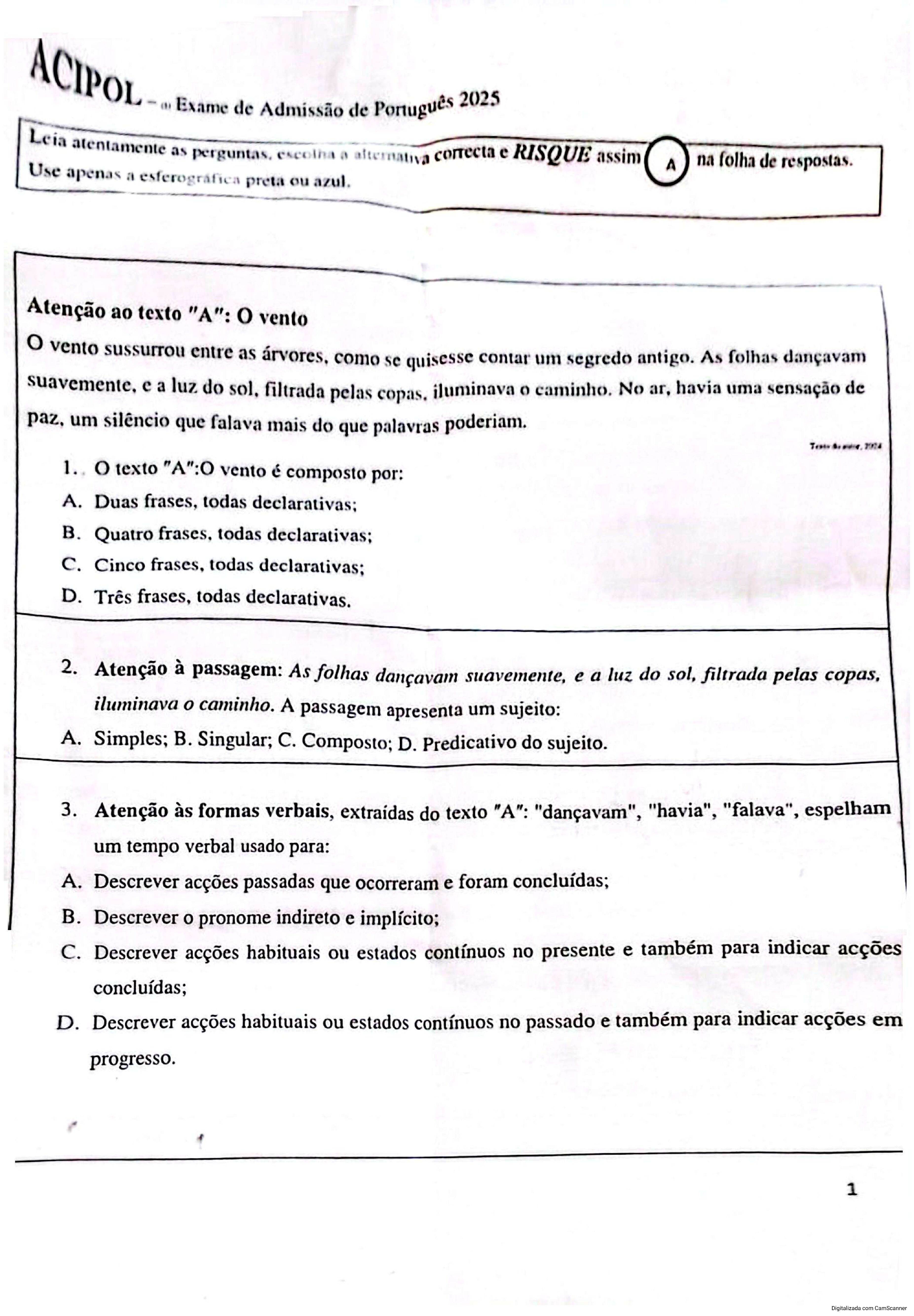 Português – 2025 da ACIPOL (Enunciado do Exame de Admissão em PDF)