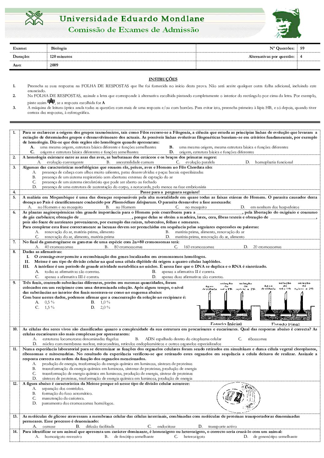 Biologia – 2009 da UEM (Enunciado do Exame Em PDF) - Baixar este documento em PDF para uso no seu ambiente académico...