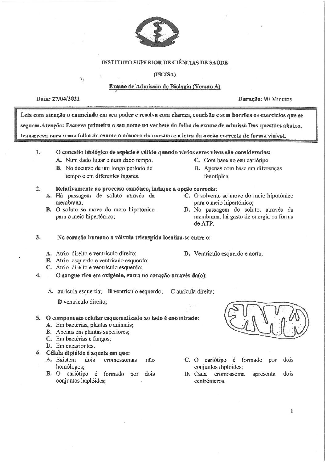 Biologia – 2021 do ISCISA (Enunciado do Exame de Admissão – Saúde – em PDF) - Baixar este documento (Exame anterior - Moçambique)...