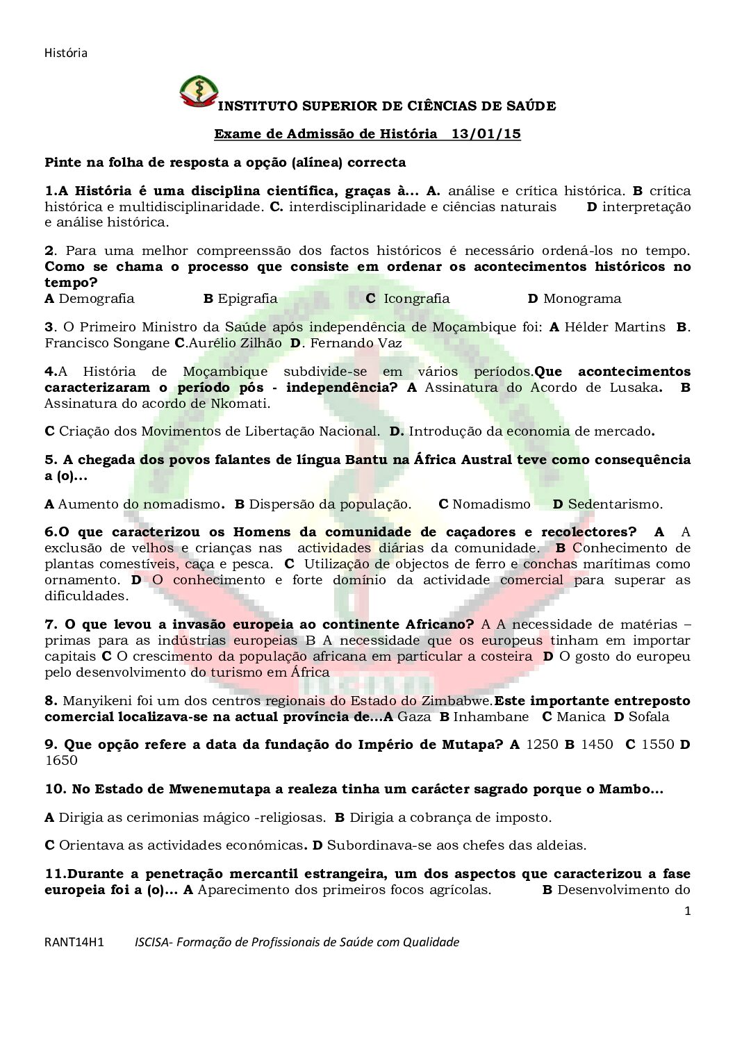 História – 2015 do ISCISA (Enunciado do Exame de Admissão – Saúde – em PDF) - Baixar este documento (Exame anterior - Moçambique)...