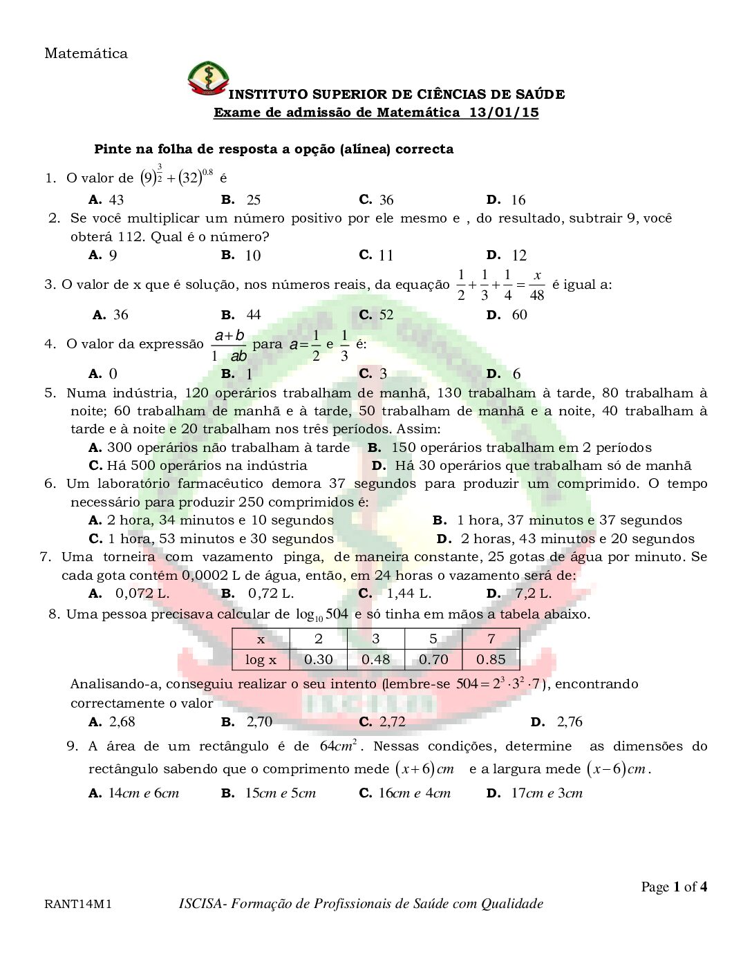 Matemática – 2015 do ISCISA (Enunciado do Exame de Admissão – Saúde – em PDF) - Baixar este documento (Exame anterior - Moçambique)...