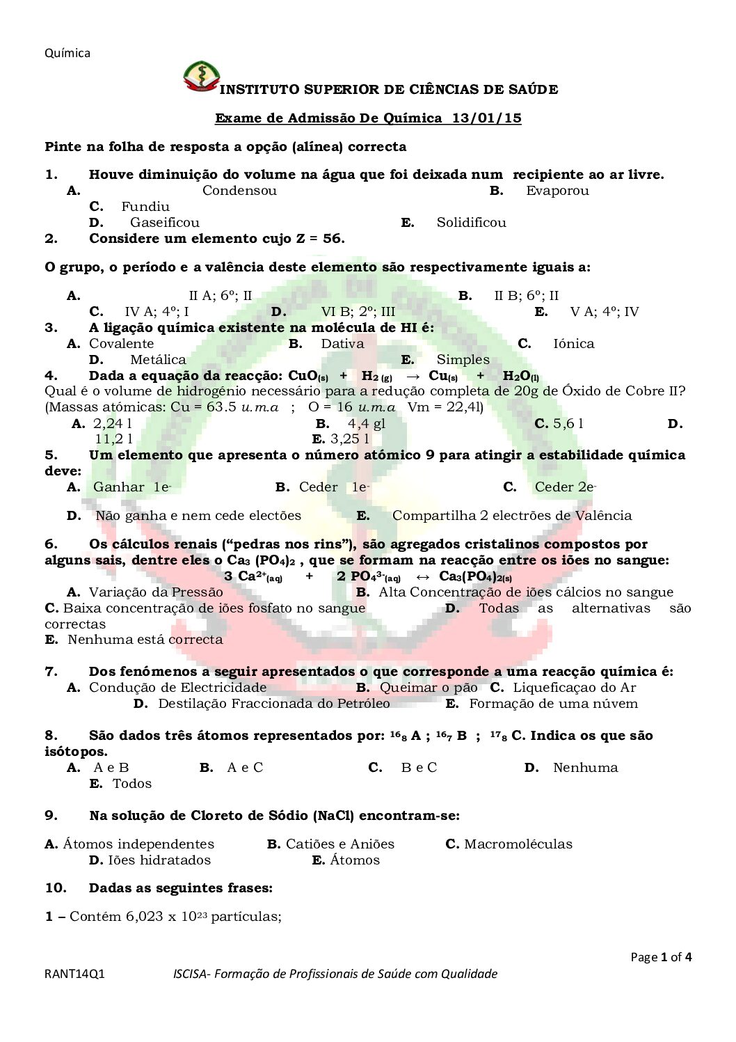 Química – 2015 do ISCISA (Enunciado do Exame de Admissão – Saúde – em PDF)