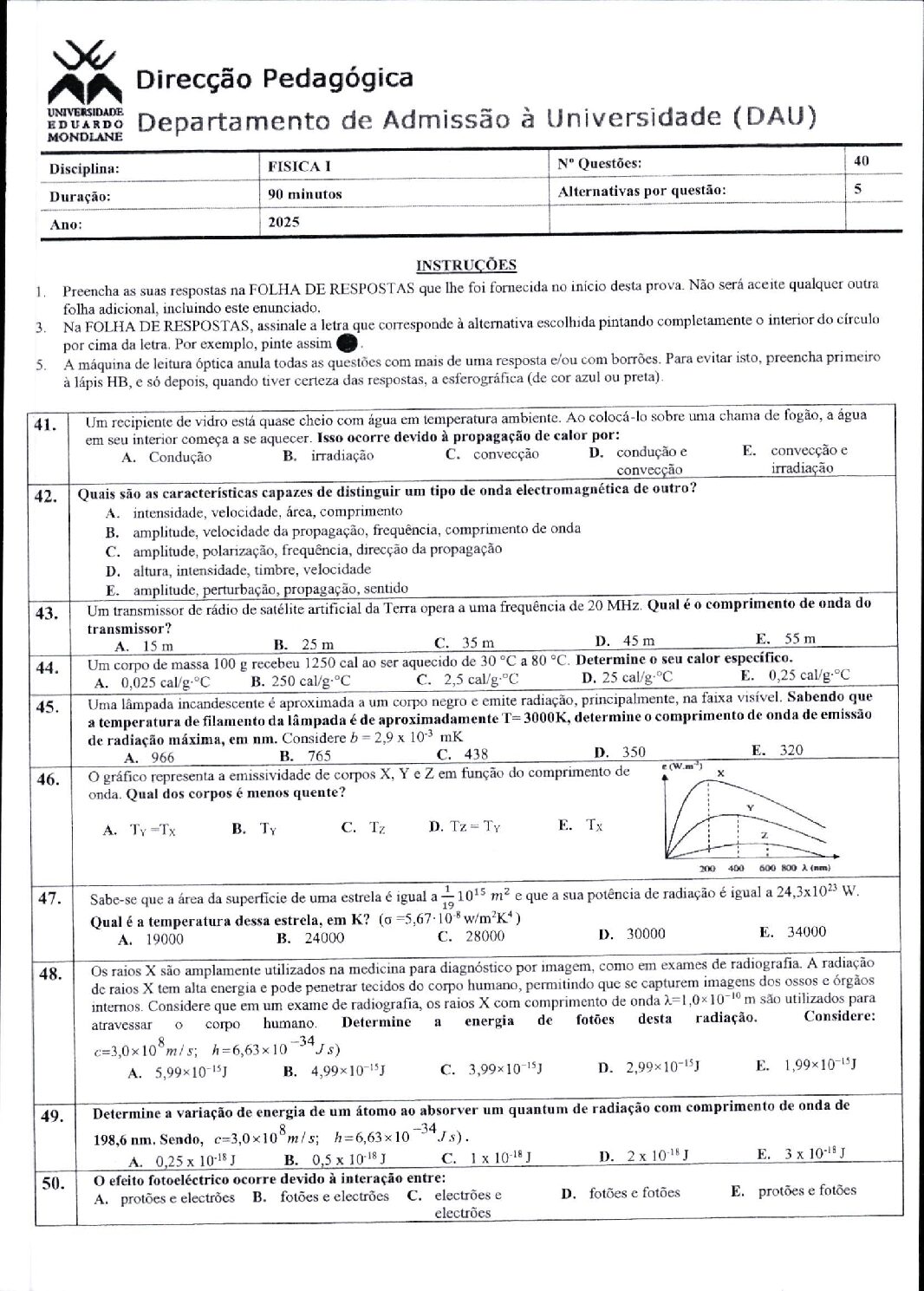 Fisica I – 2025 da UEM (Enunciado do Exame em PDF)