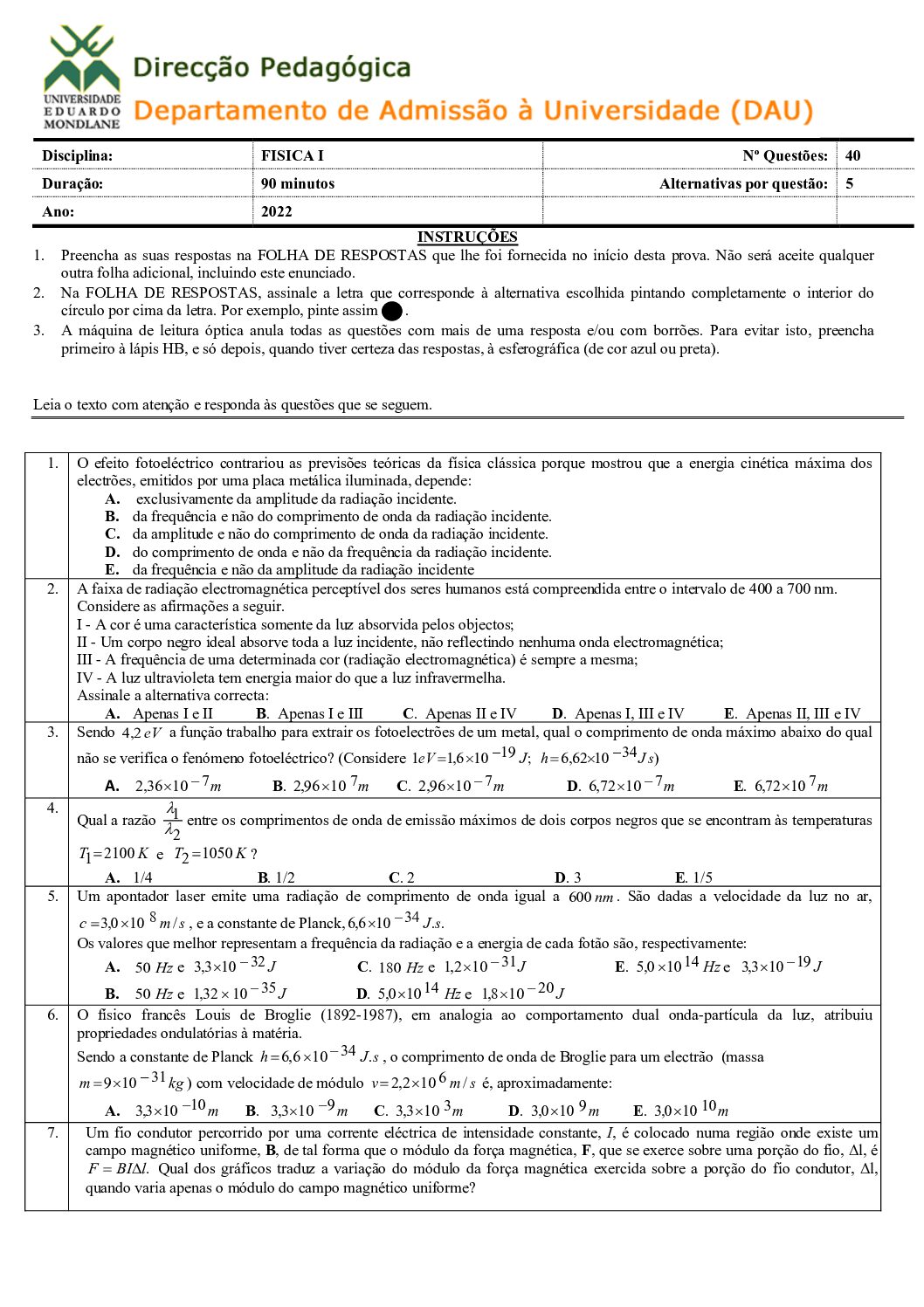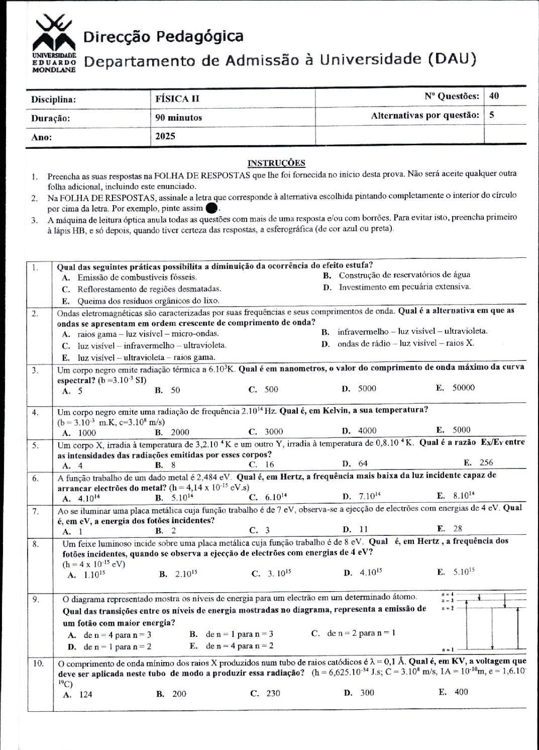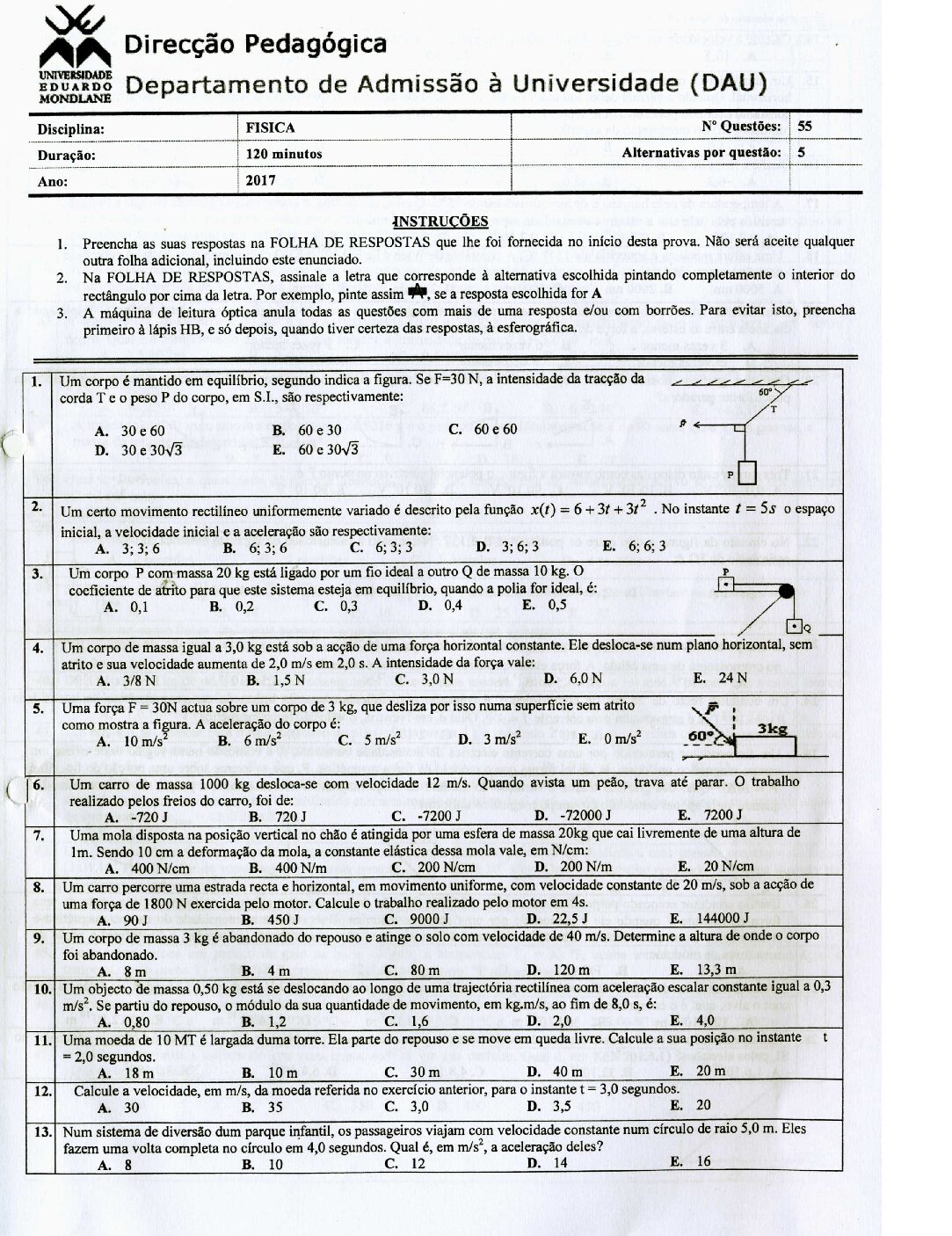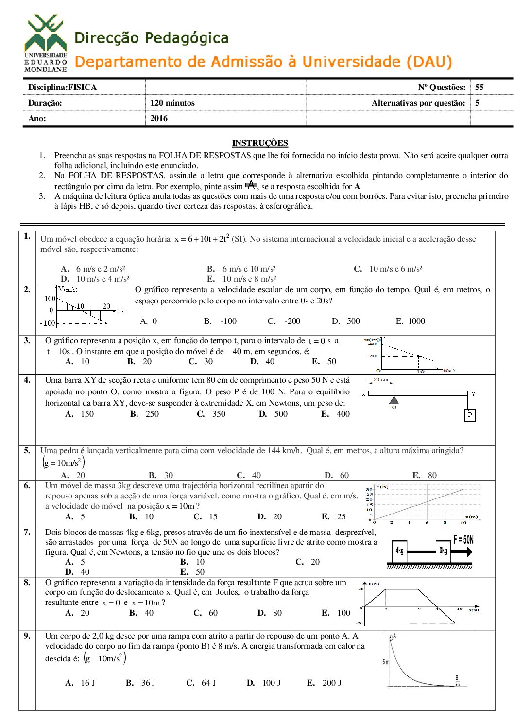 Fisica I – 2025 da UEM (Enunciado do Exame em PDF)