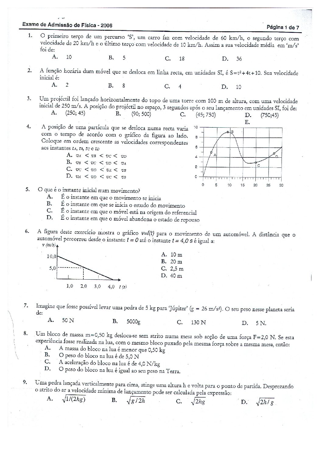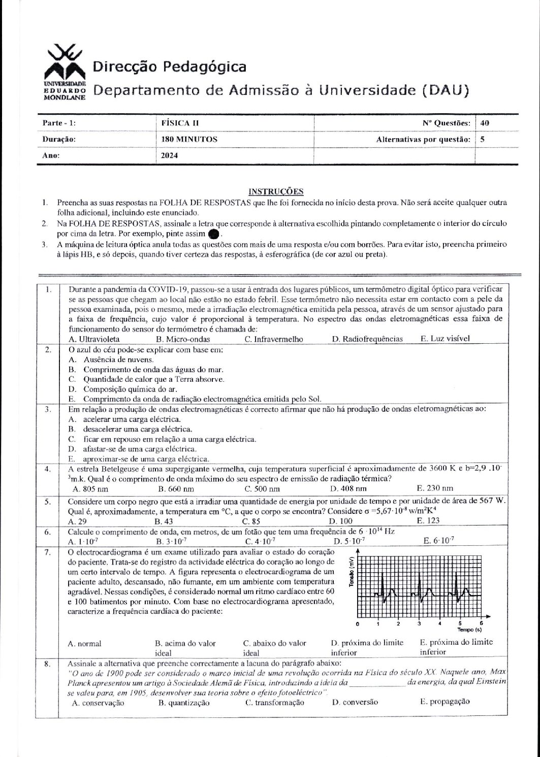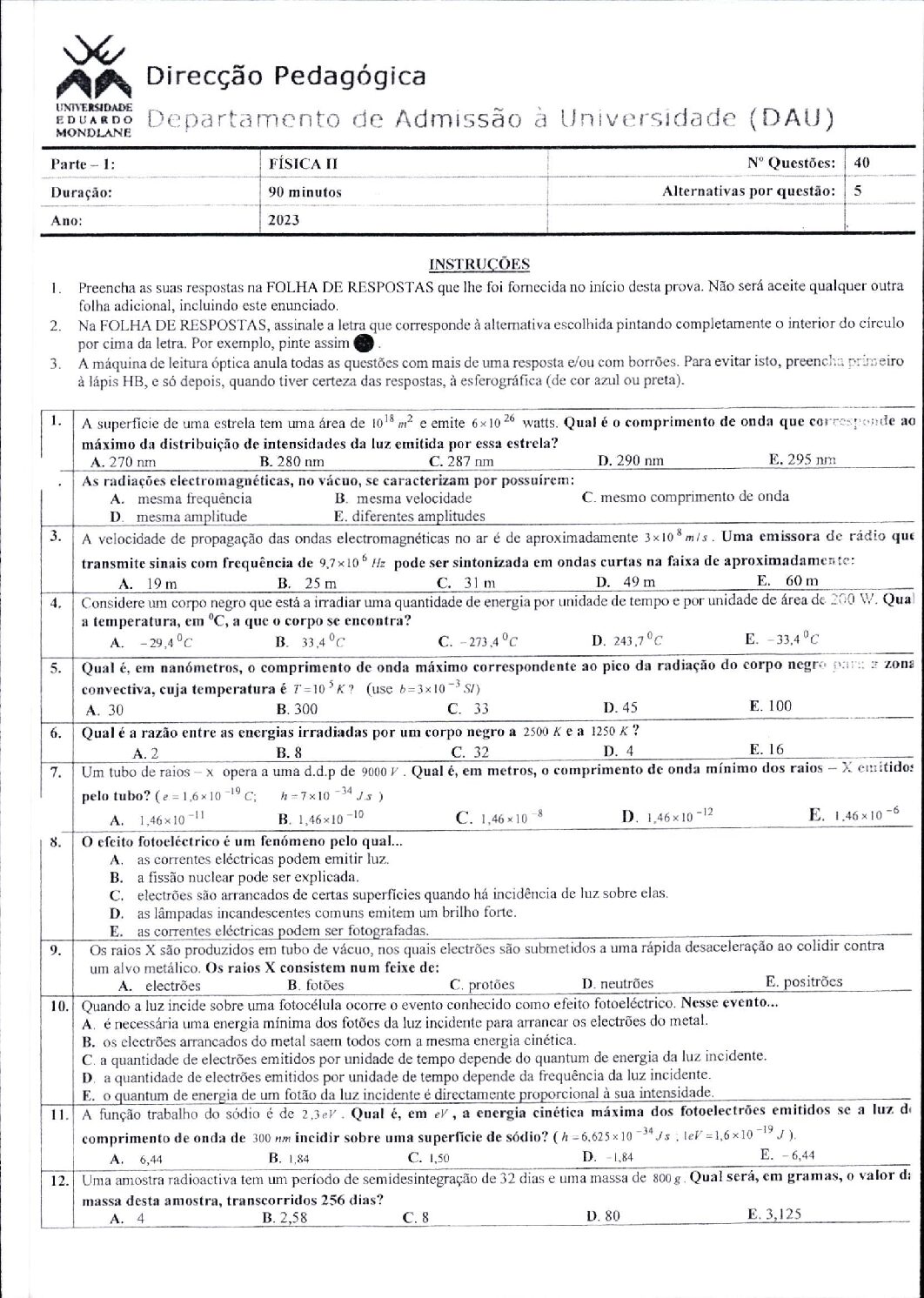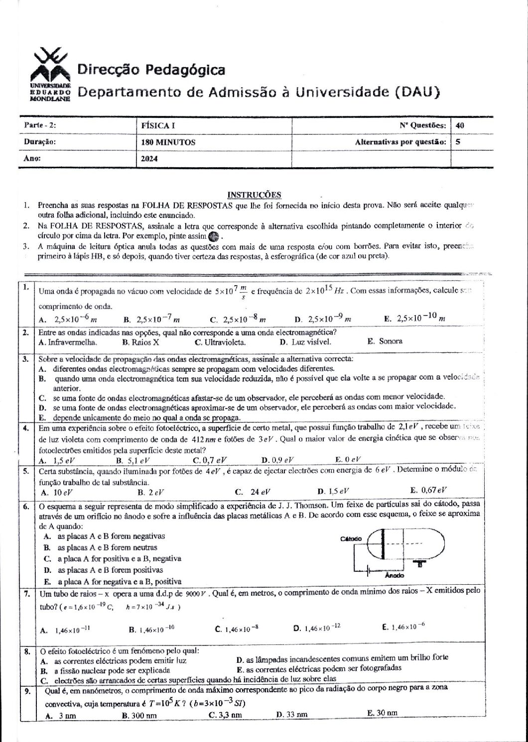 Fisica I – 2025 da UEM (Enunciado do Exame em PDF)