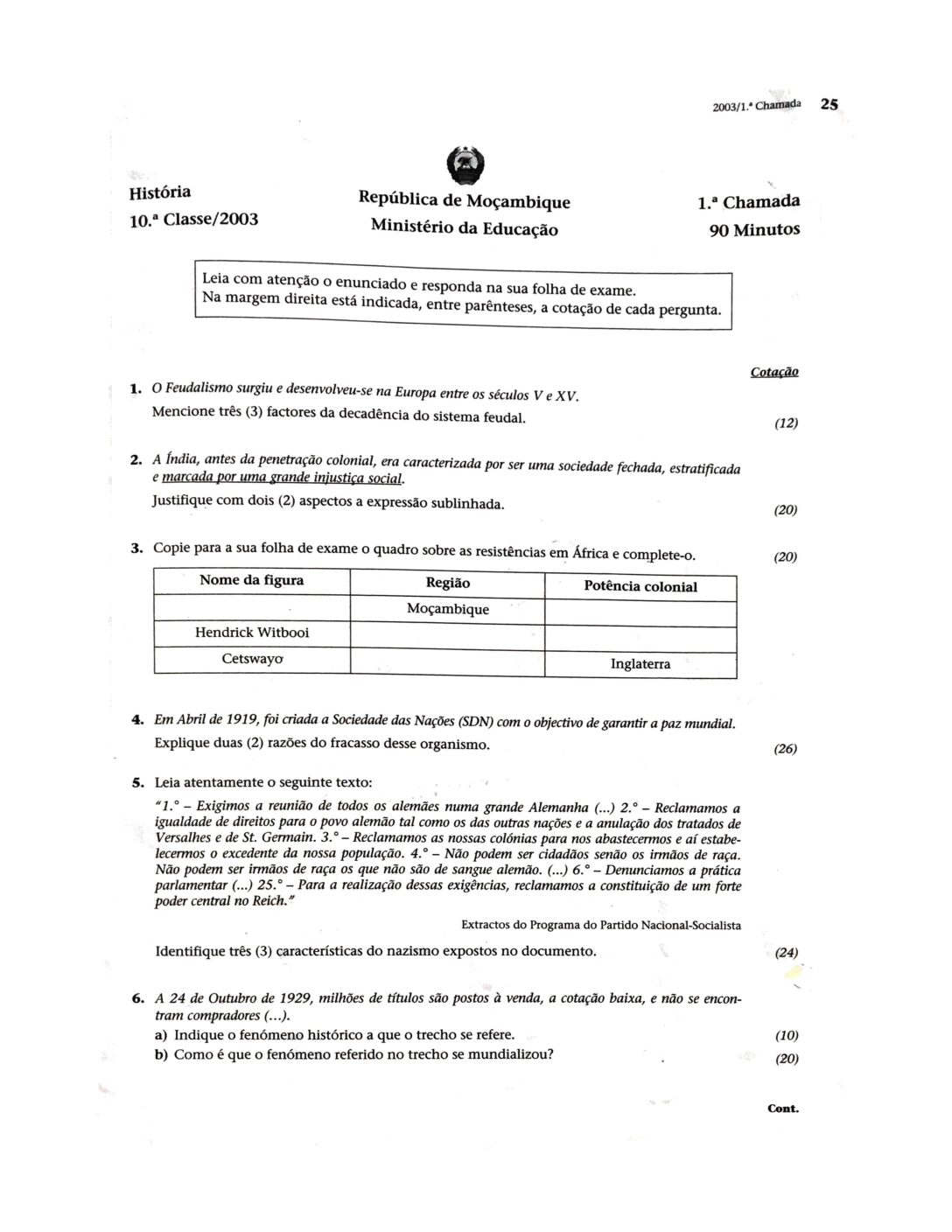 História 2003 – 1ª Chamada da 10ª classe (Enunciado do Exame em PDF)