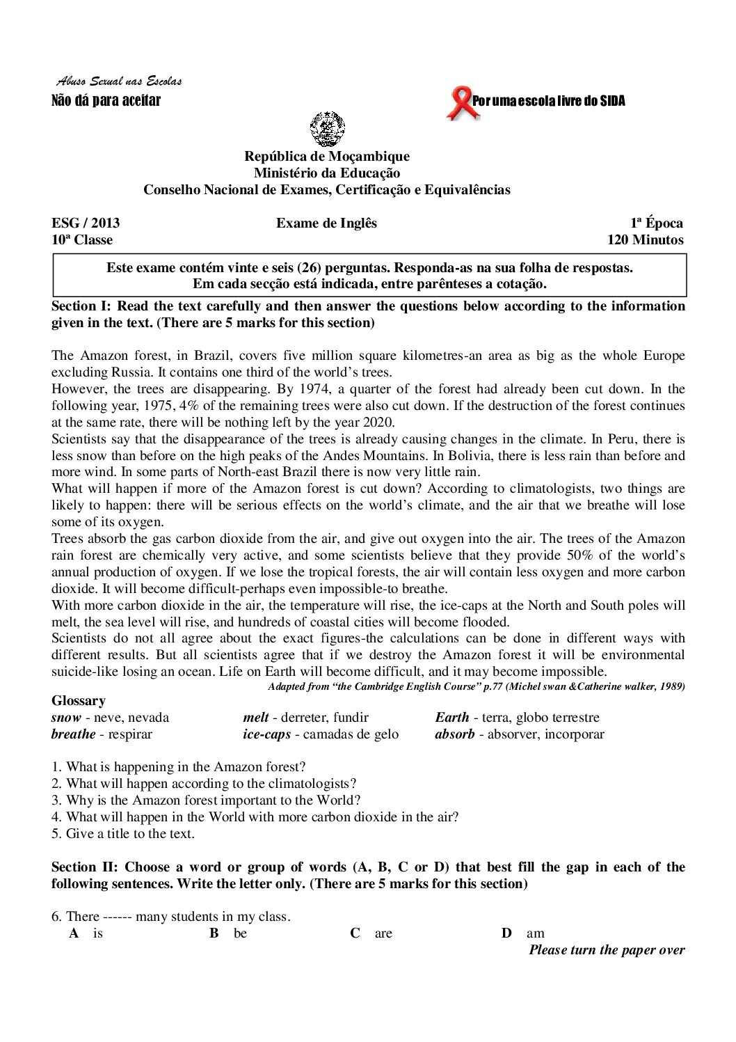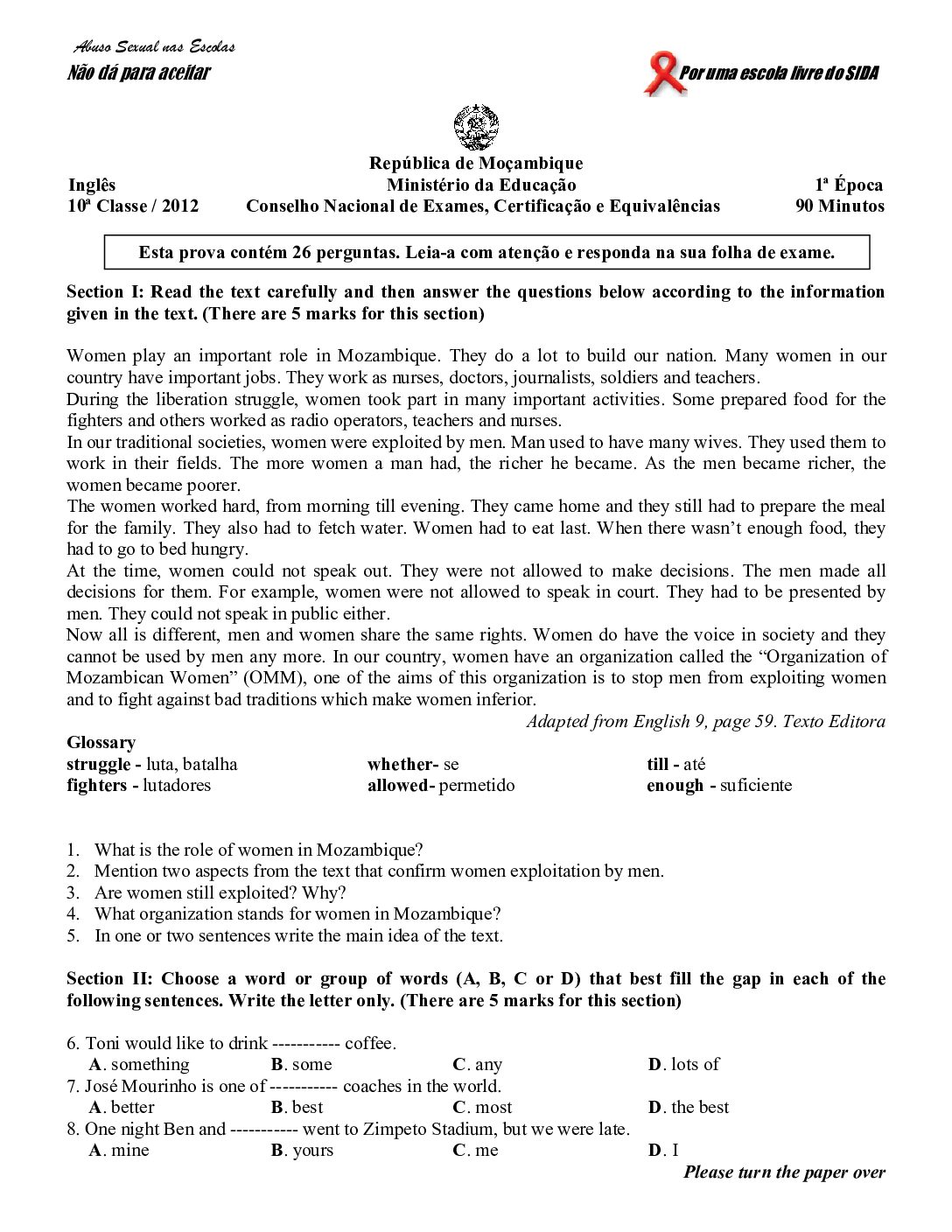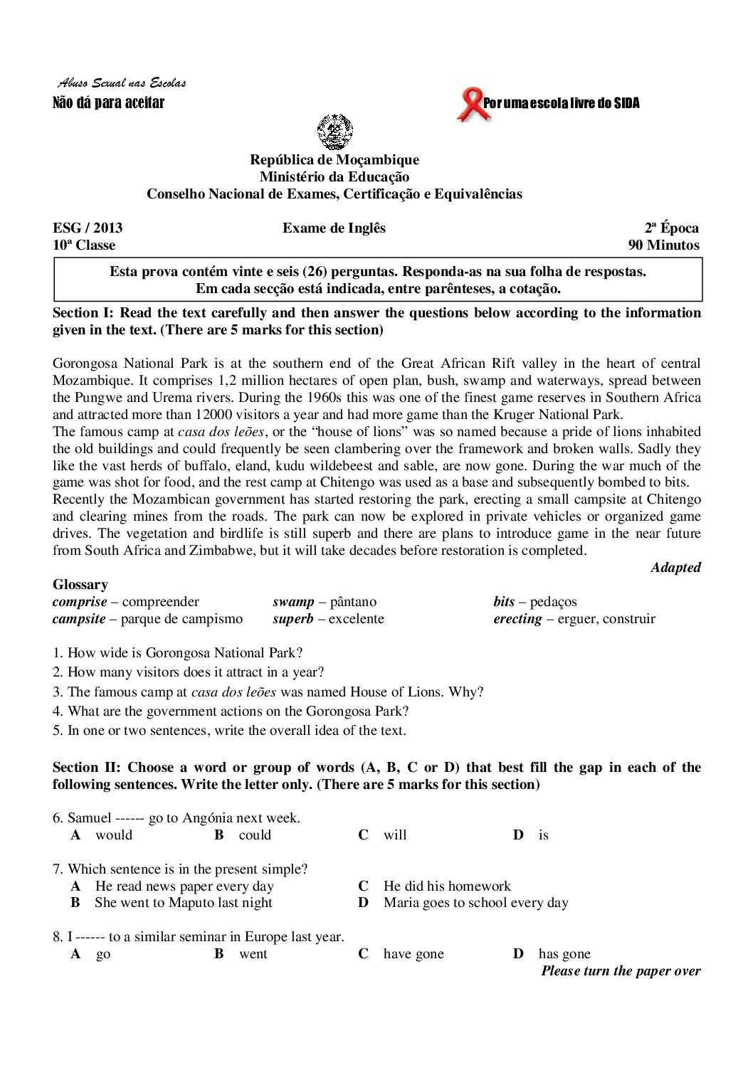 Inglês 2014 – 2ª Chamada da 10ª classe (Enunciado do Exame em PDF) - Baixar este documento, de forma simples, segura e grátis,...