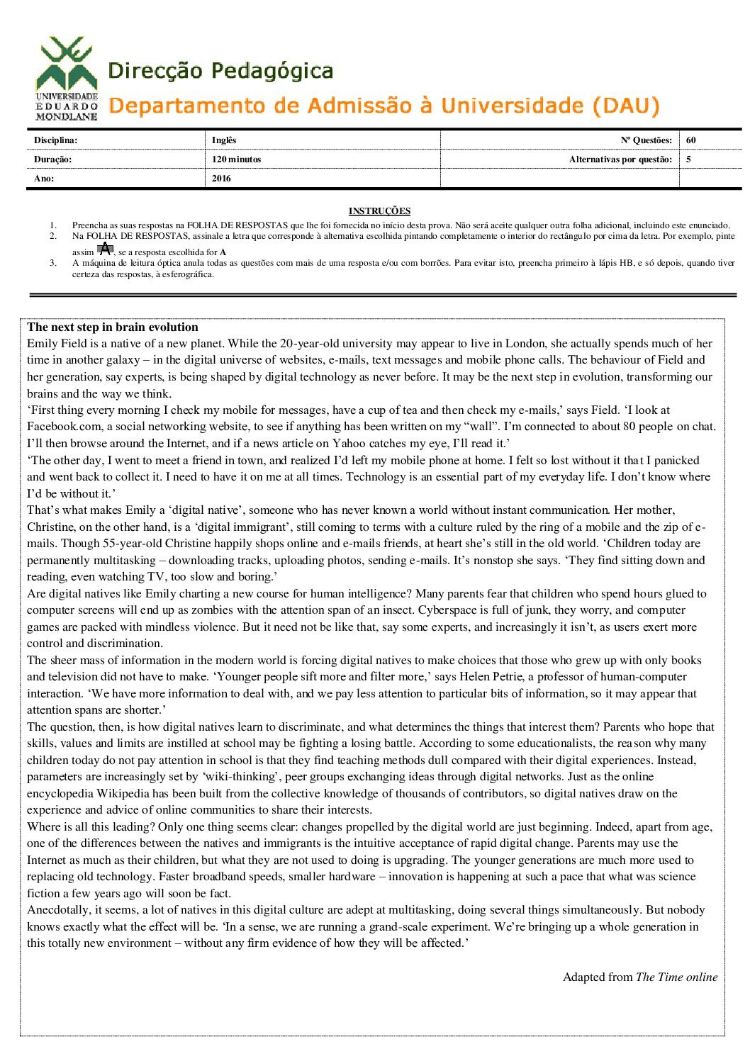 Inglês – 2016 da UEM (Enunciado do Exame em PDF) - Baixar este documento em PDF para uso no seu ambiente académico...