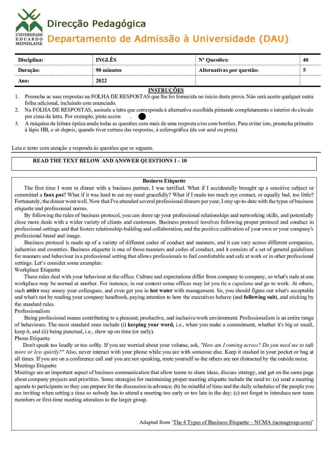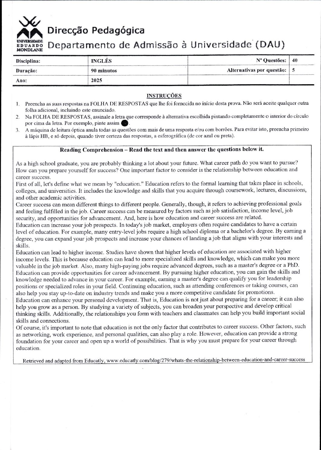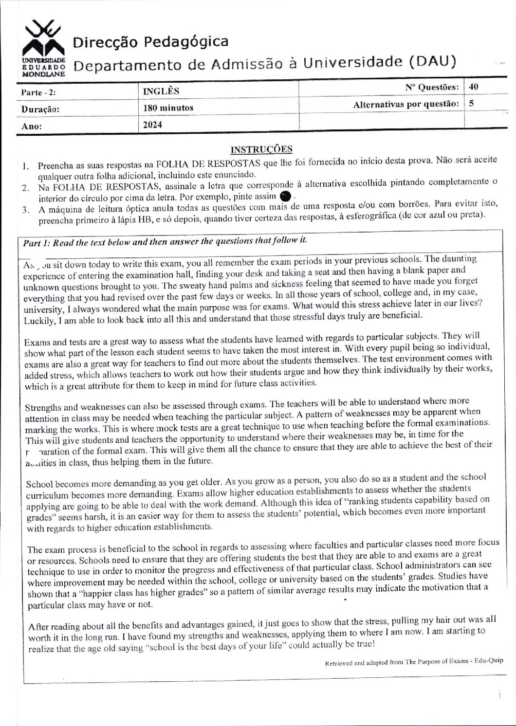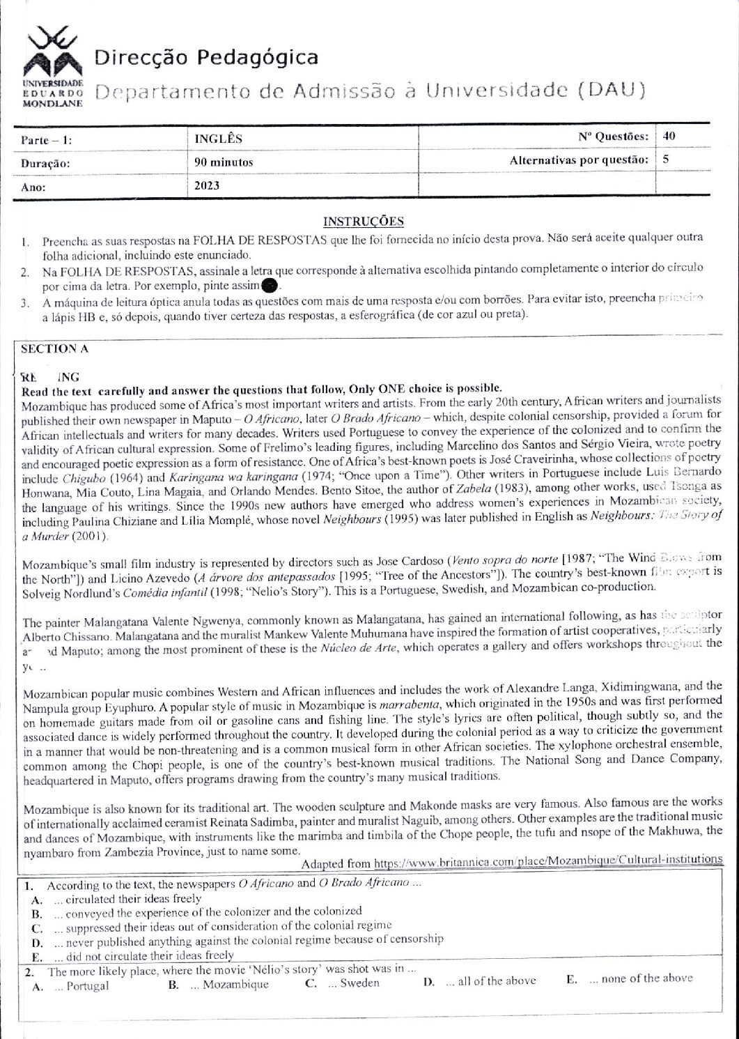 Inglês – 2023 da UEM (Enunciado do Exame em PDF) - Baixar este documento em PDF para uso no seu ambiente académico...