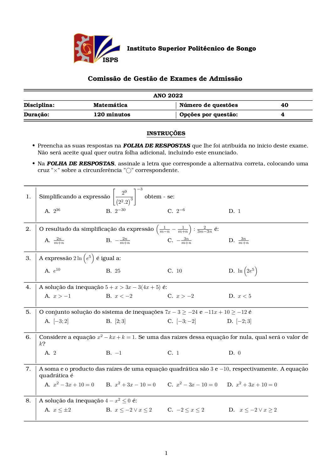 Matemática – 2021 do ISPSongo [Enunciado do Exame de Admissão em PDF]