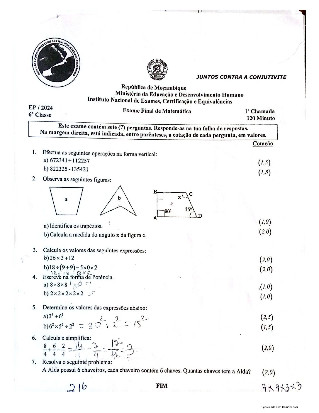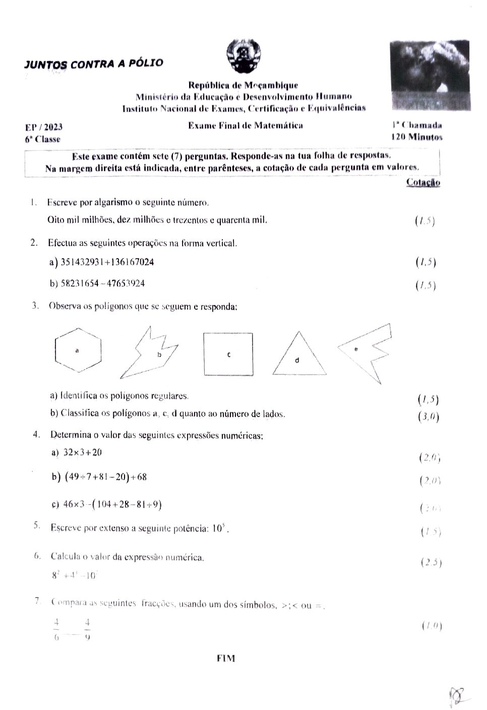Matemática 2024 -1ª Chamada da 6ª Classe (Enunciado do Exame em PDF)