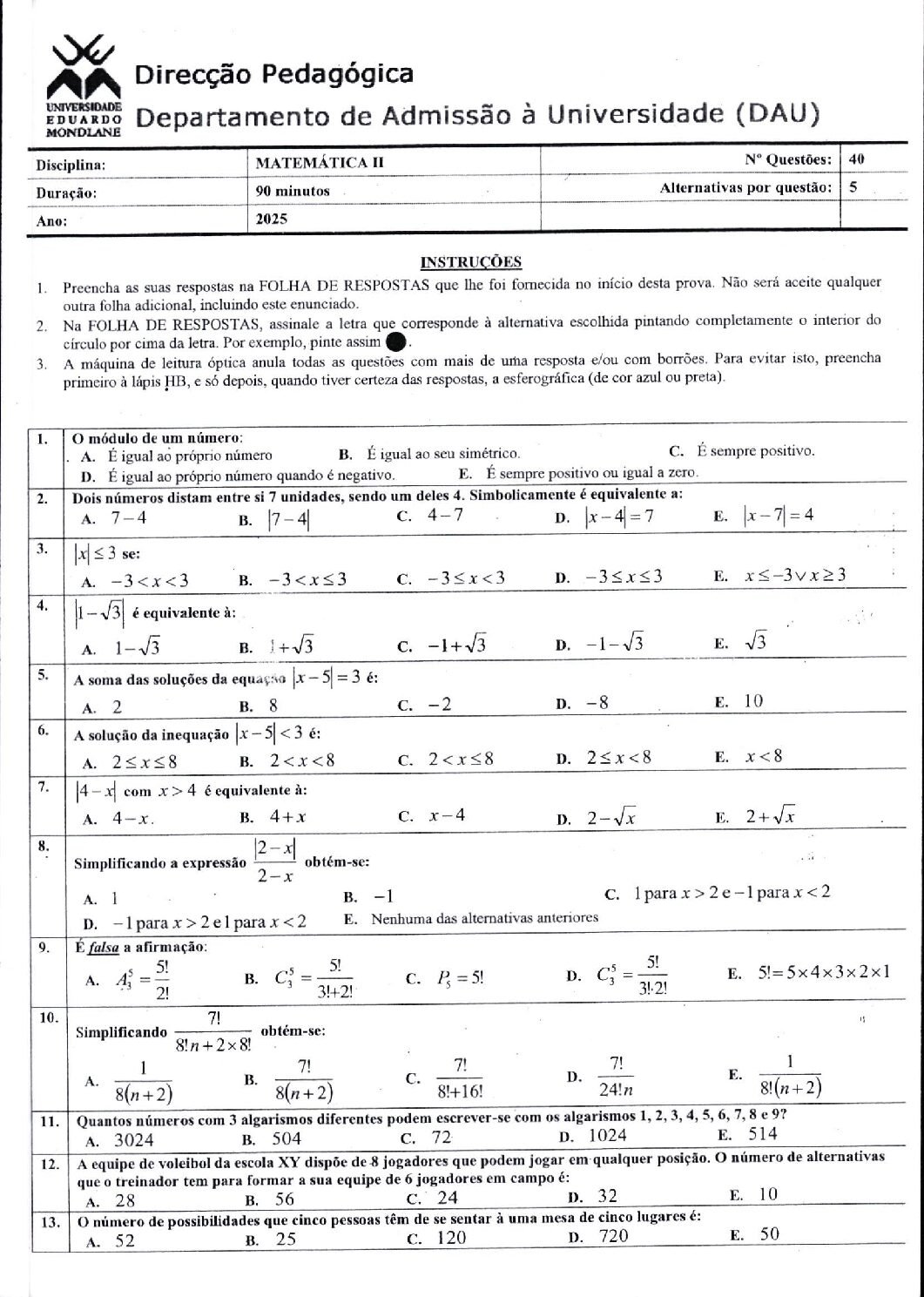 Matemática II – 2025 da UEM (Enunciado do Exame em PDF) - Baixar este documento em PDF para uso no seu ambiente académico...