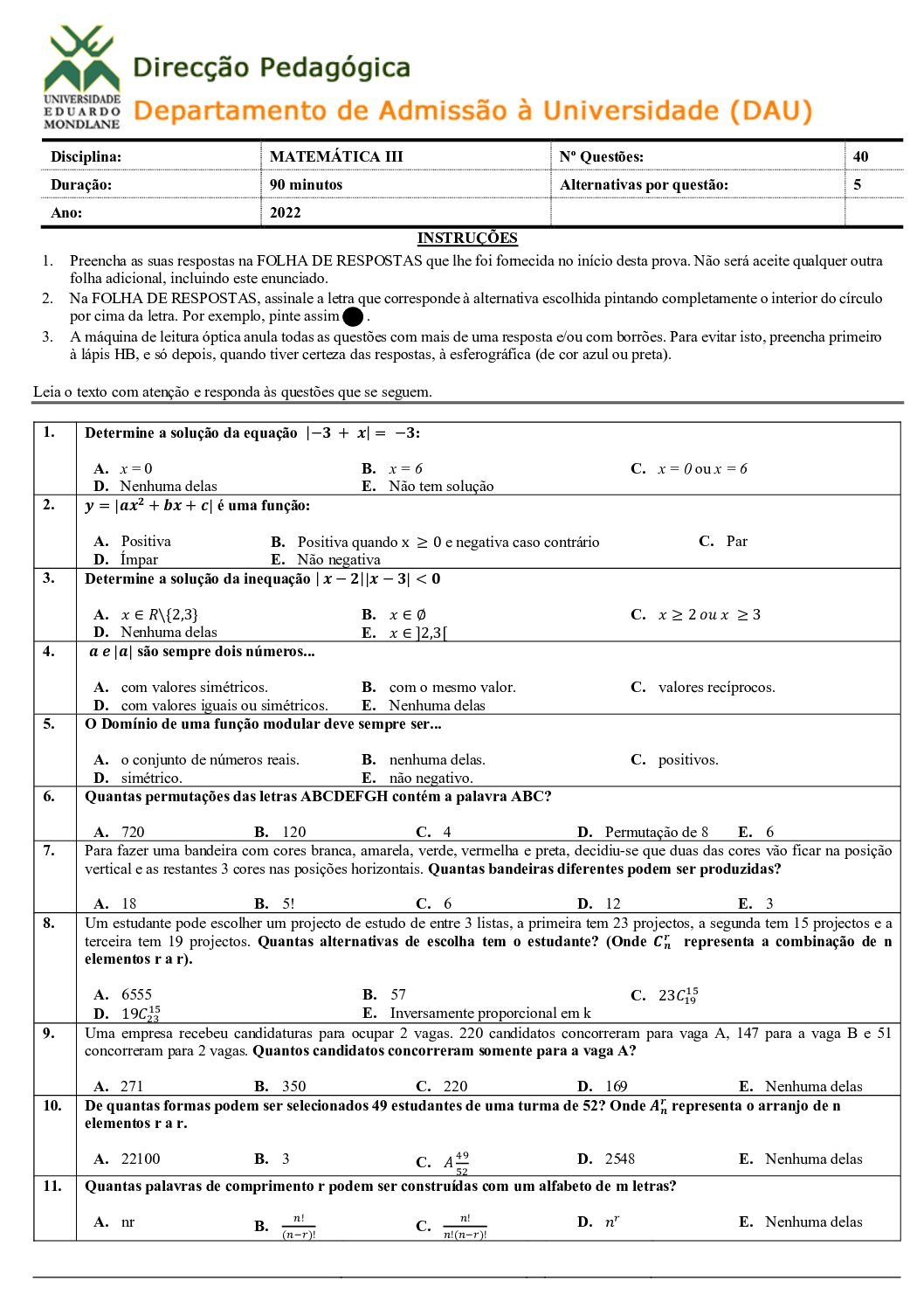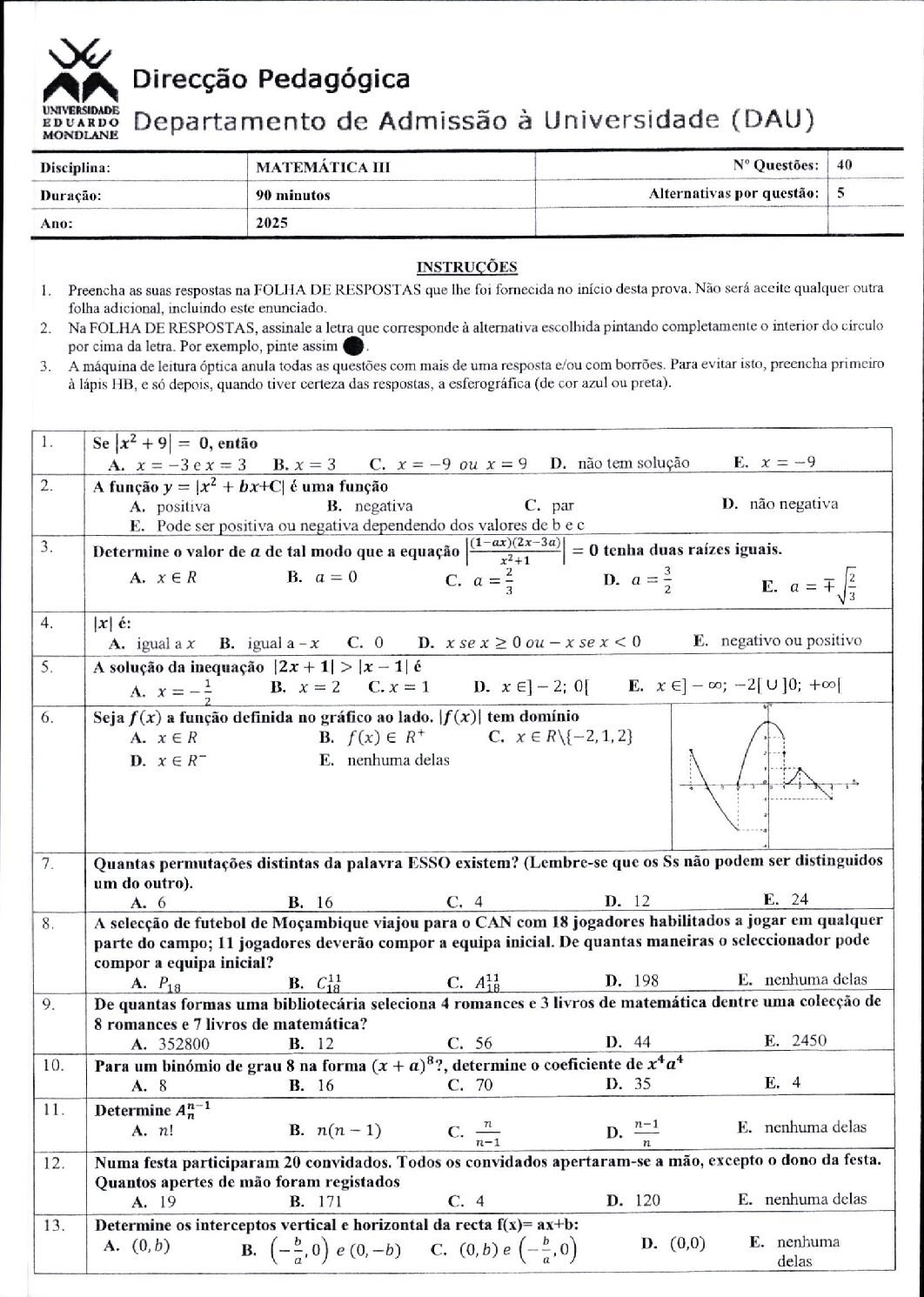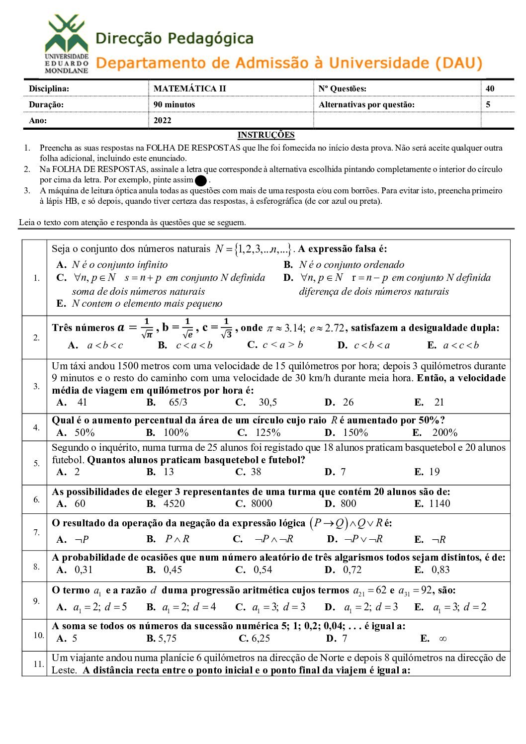 Matemática II – 2025 da UEM (Enunciado do Exame em PDF) - Baixar este documento em PDF para uso no seu ambiente académico...