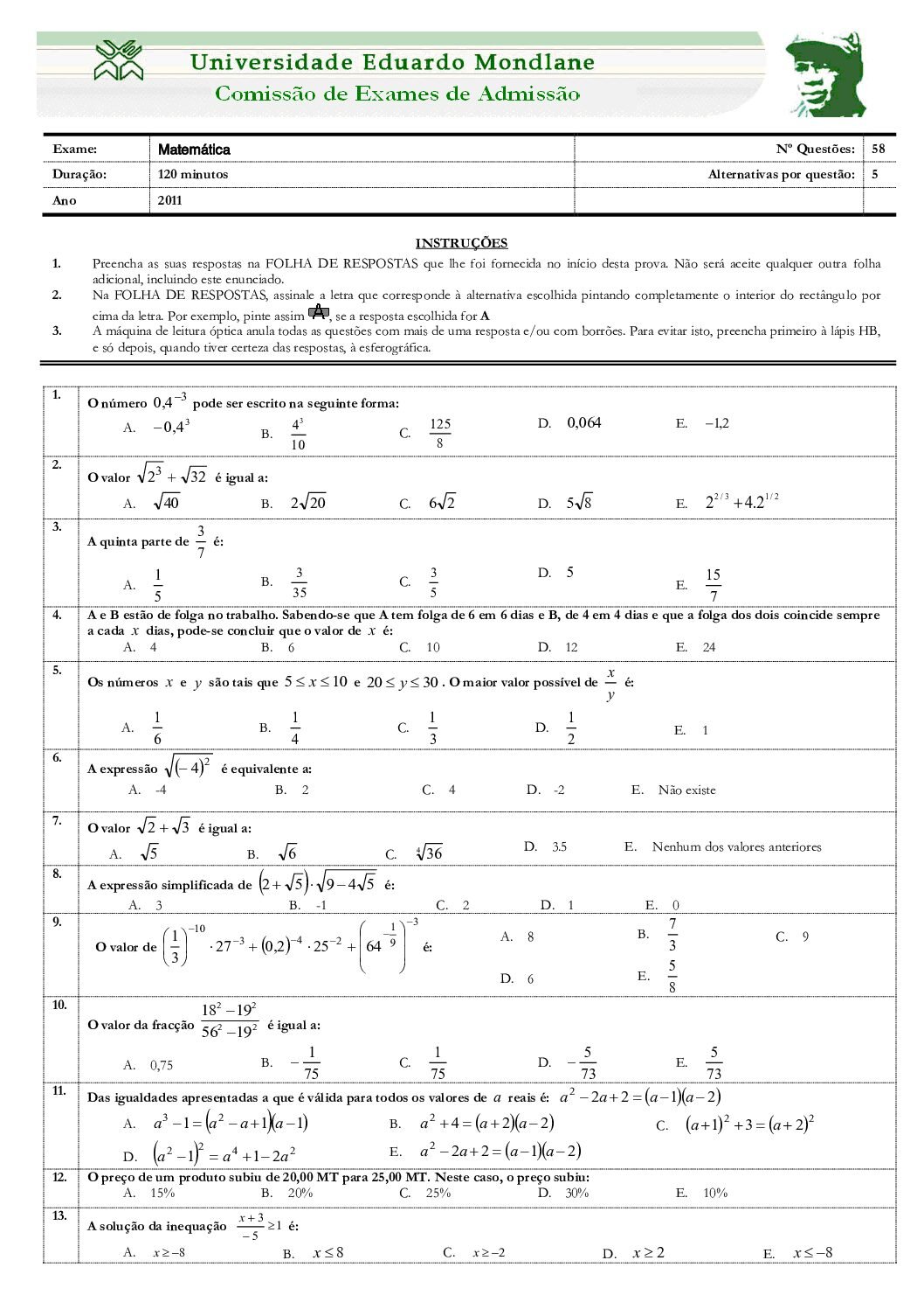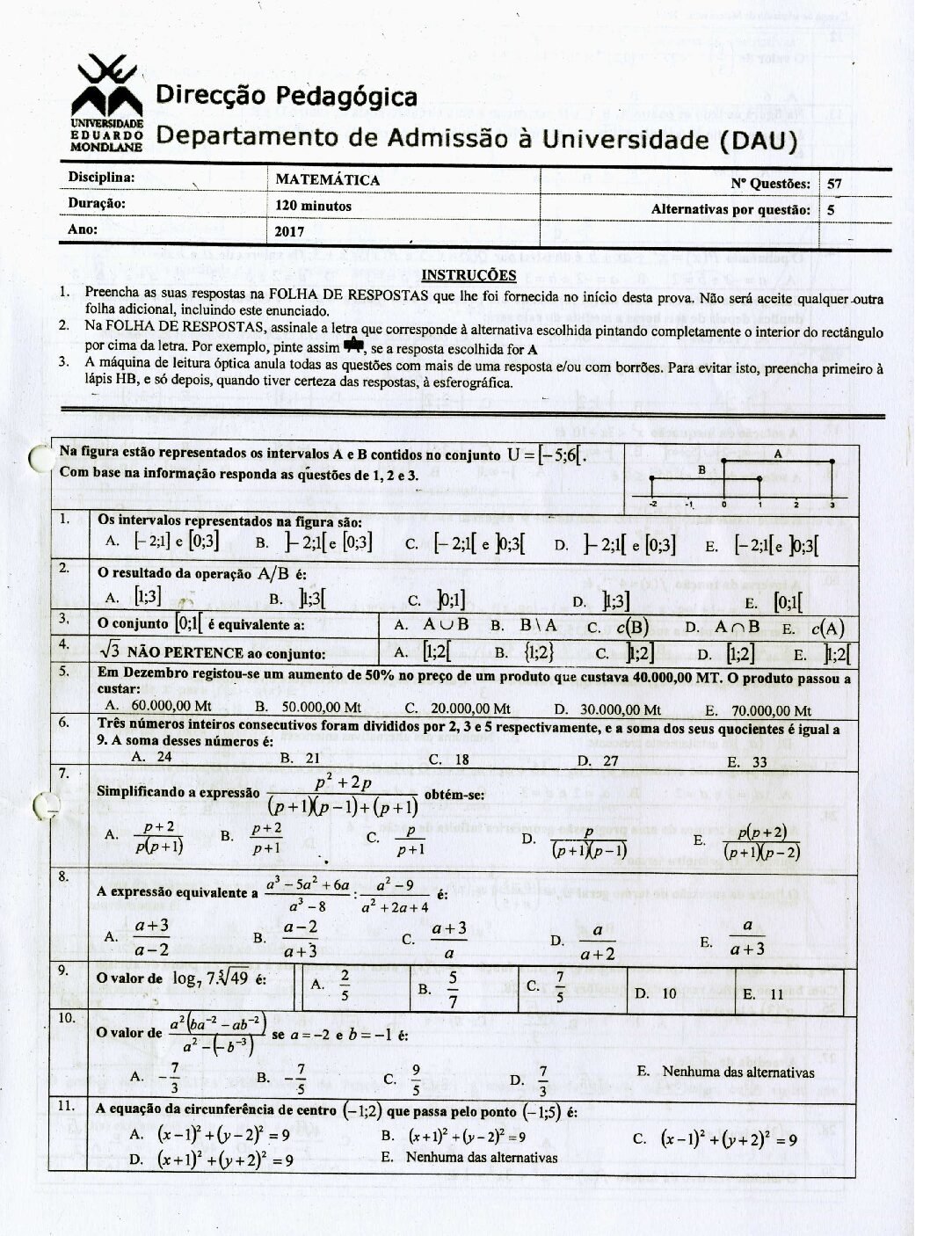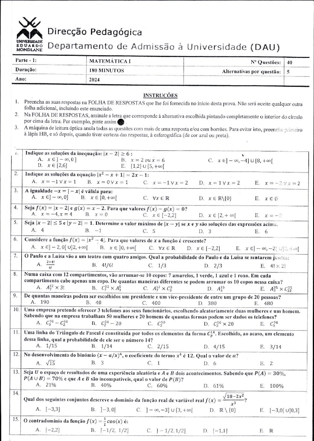 Matemática II – 2025 da UEM (Enunciado do Exame em PDF) - Baixar este documento em PDF para uso no seu ambiente académico...