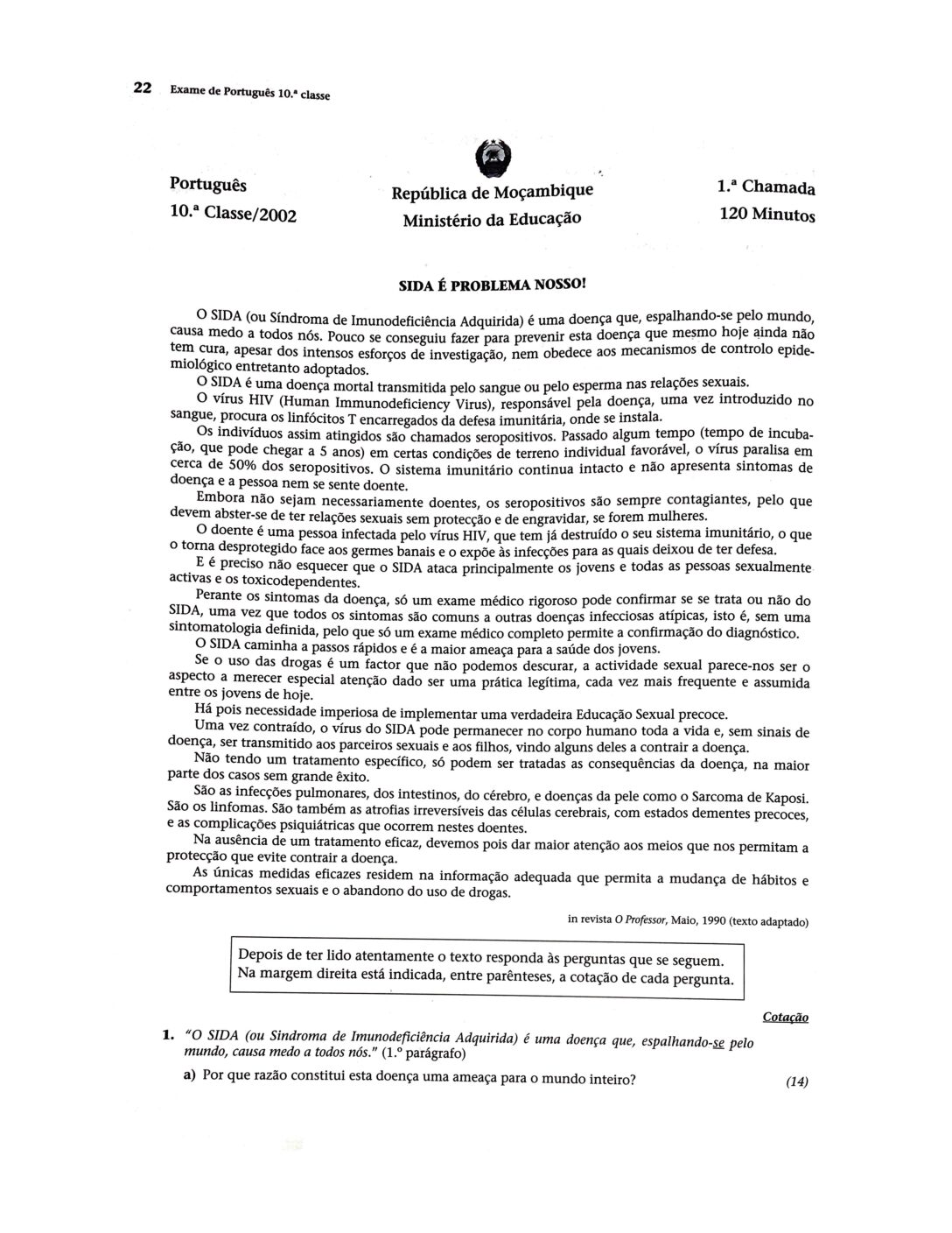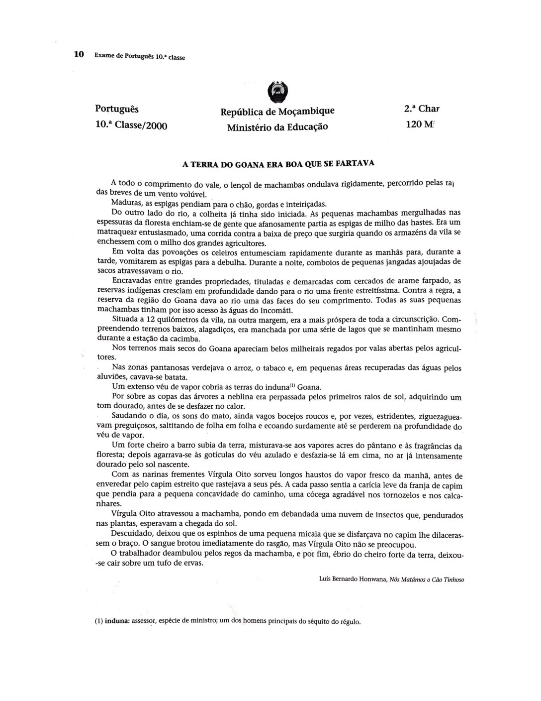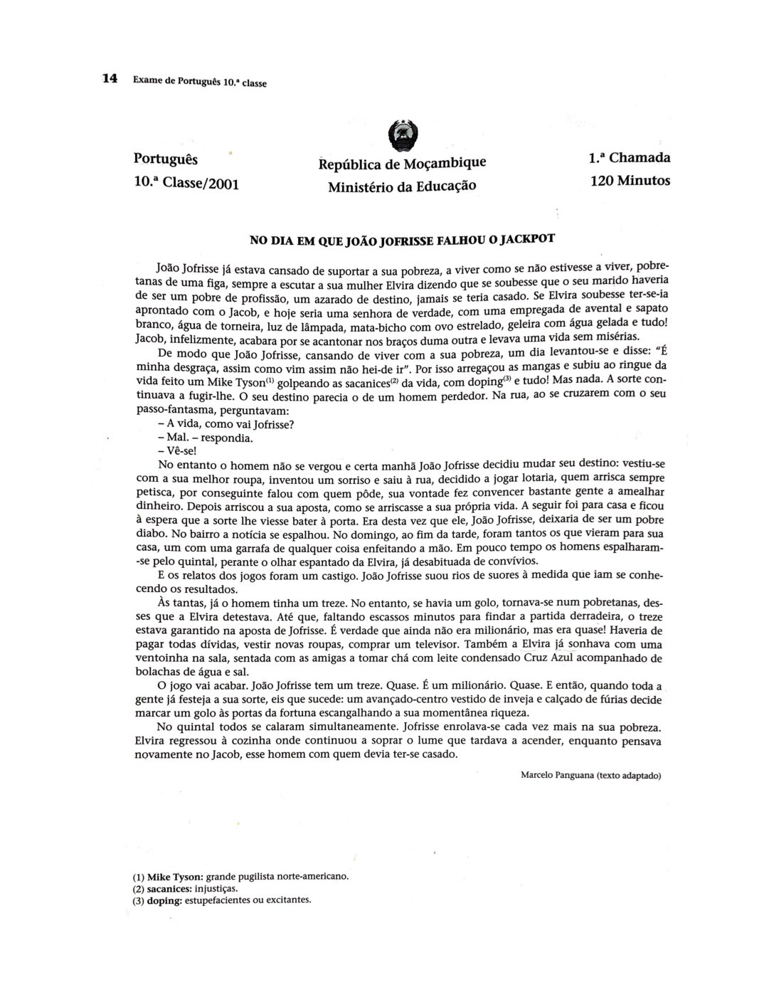 Português 2016 – 1ª Chamada da 10ª classe (Enunciado do Exame em PDF)