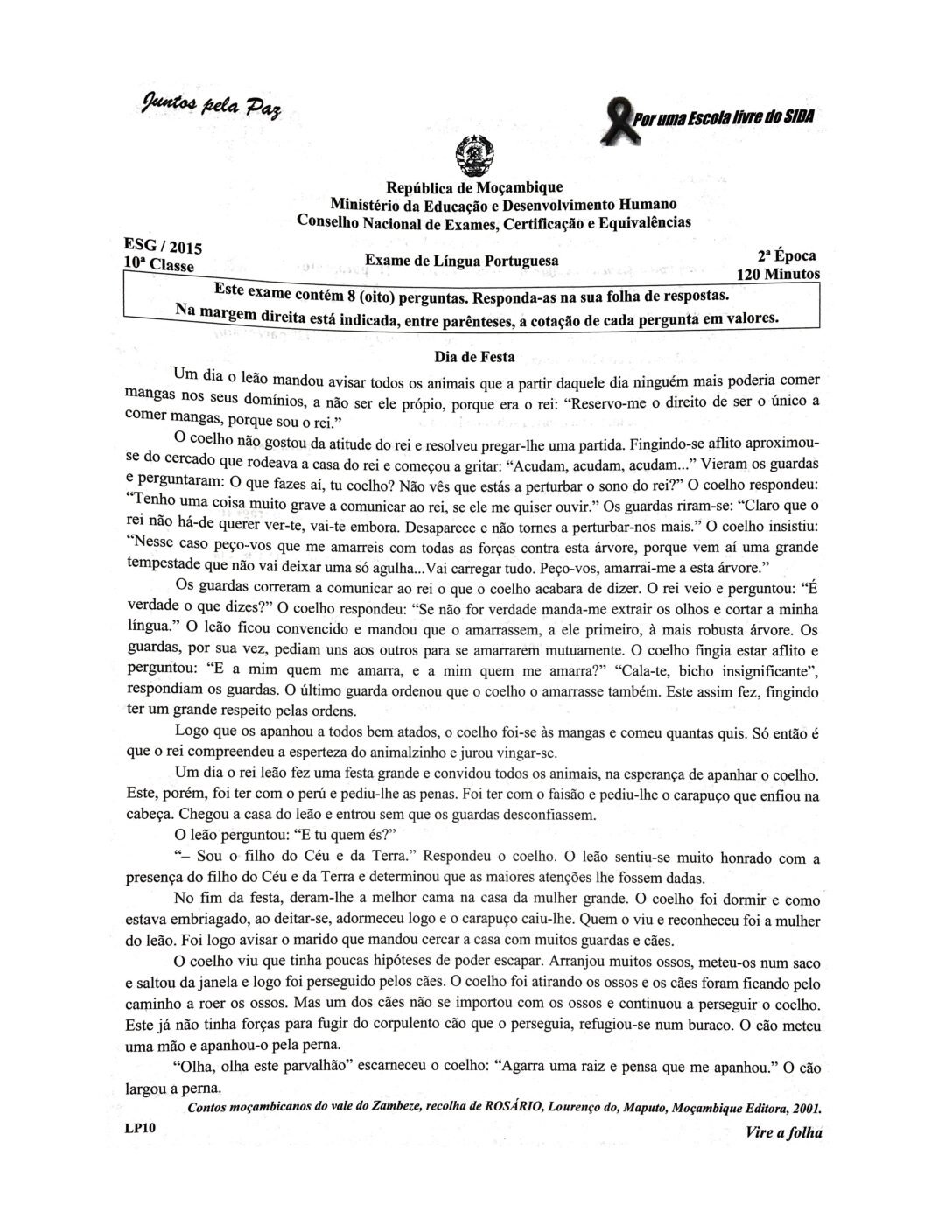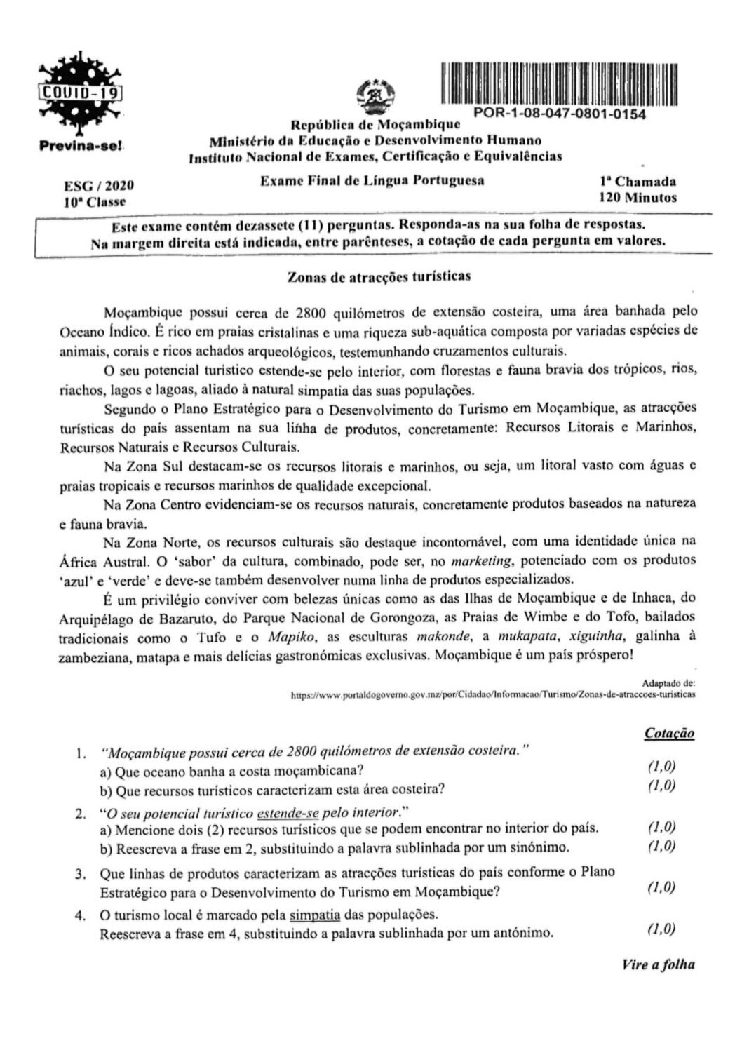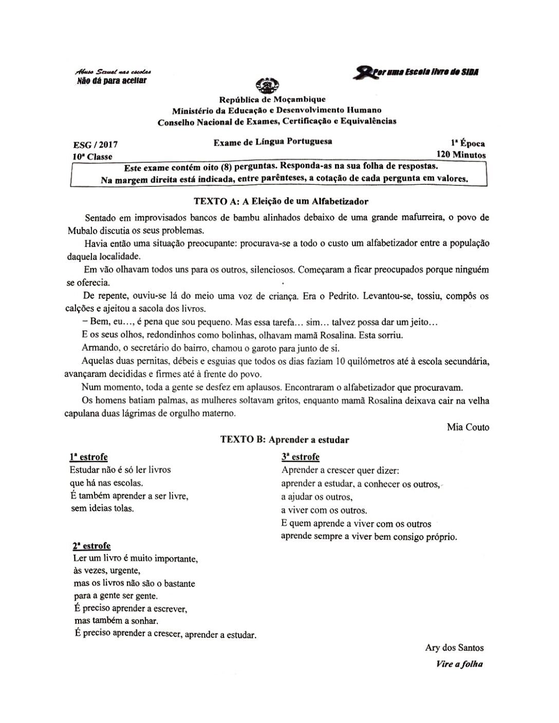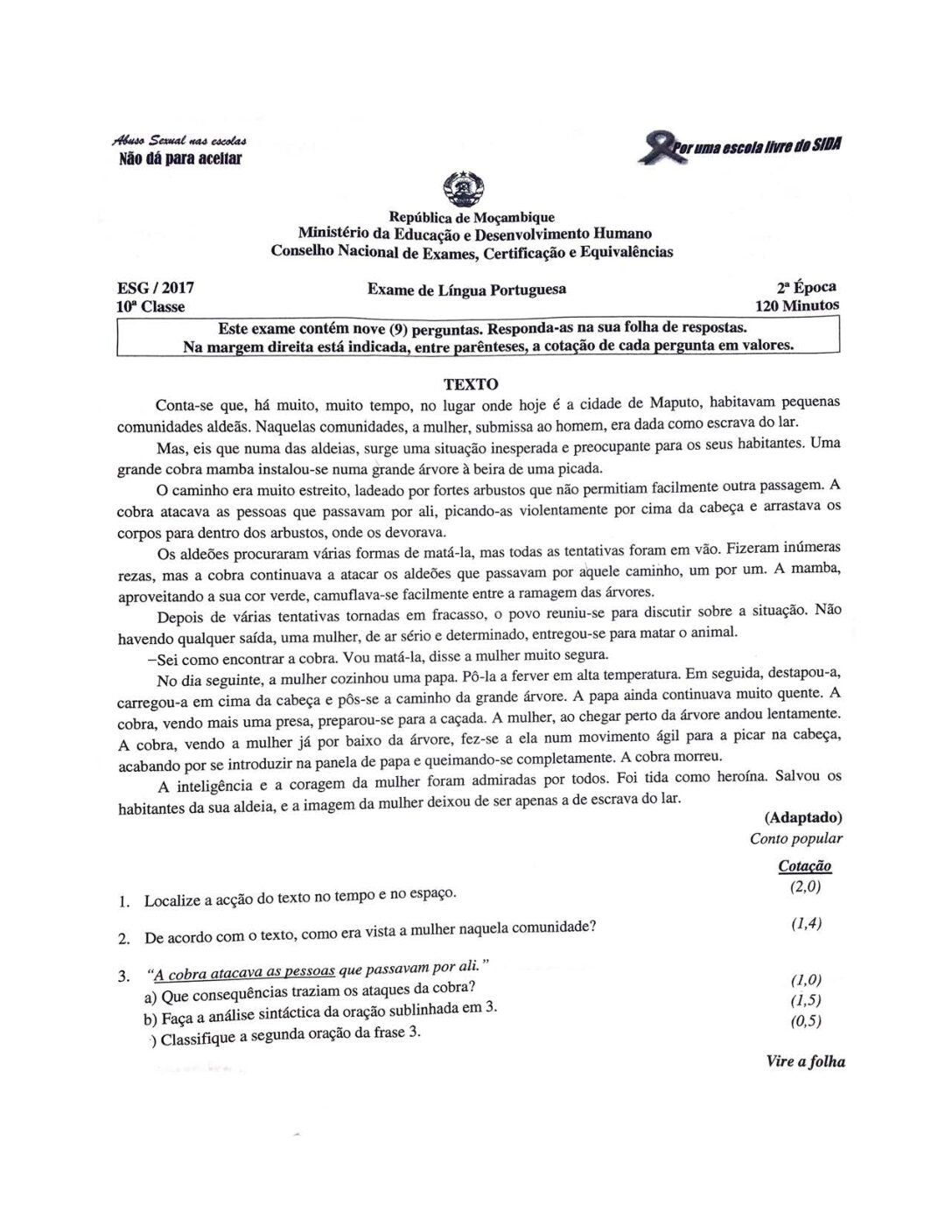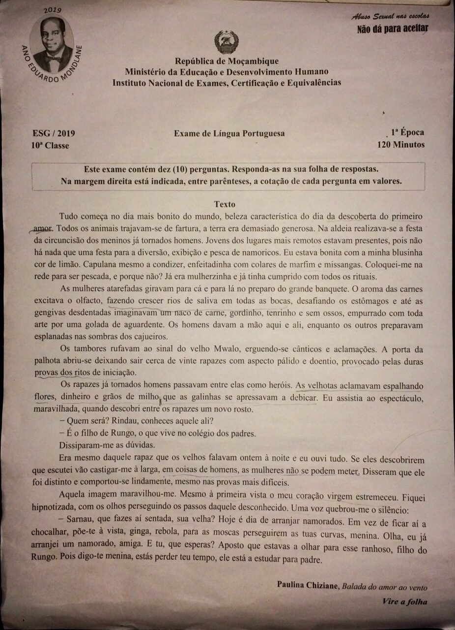 Português 2017 – 2ª Chamada da 10ª classe (Enunciado do Exame em PDF)
