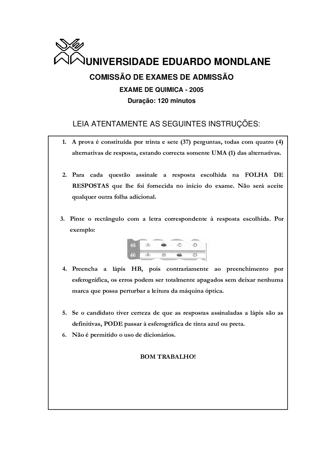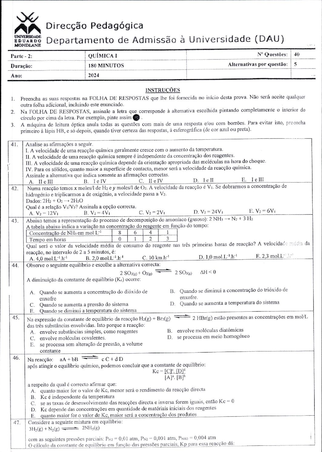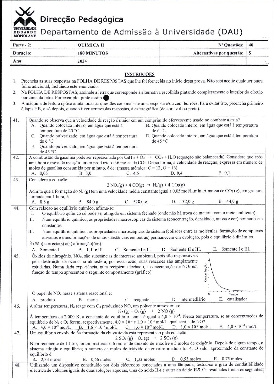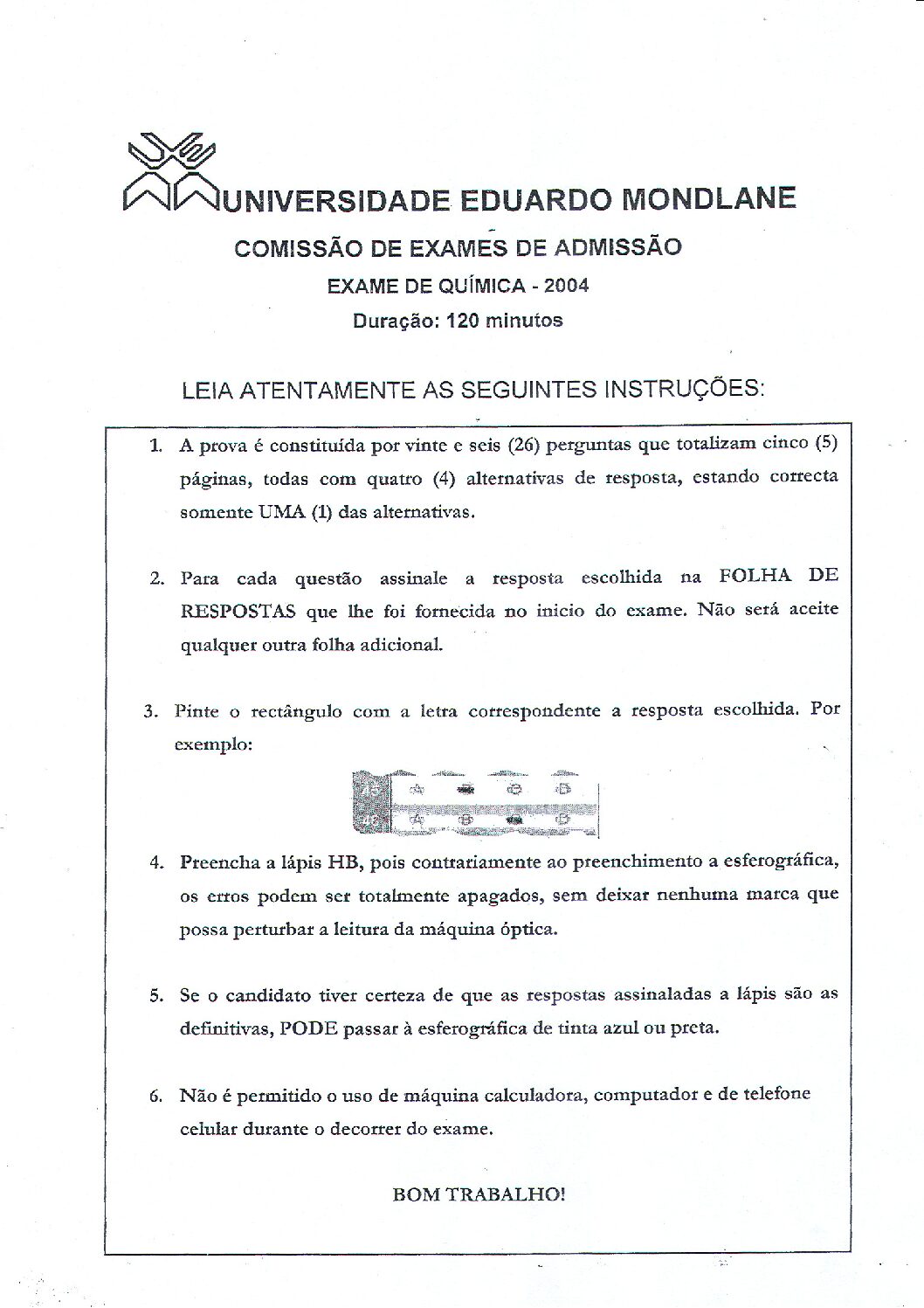 Química 2 – 2025 da UEM (Enunciado do Exame em PDF) - Baixar este documento em PDF para uso no seu ambiente académico...