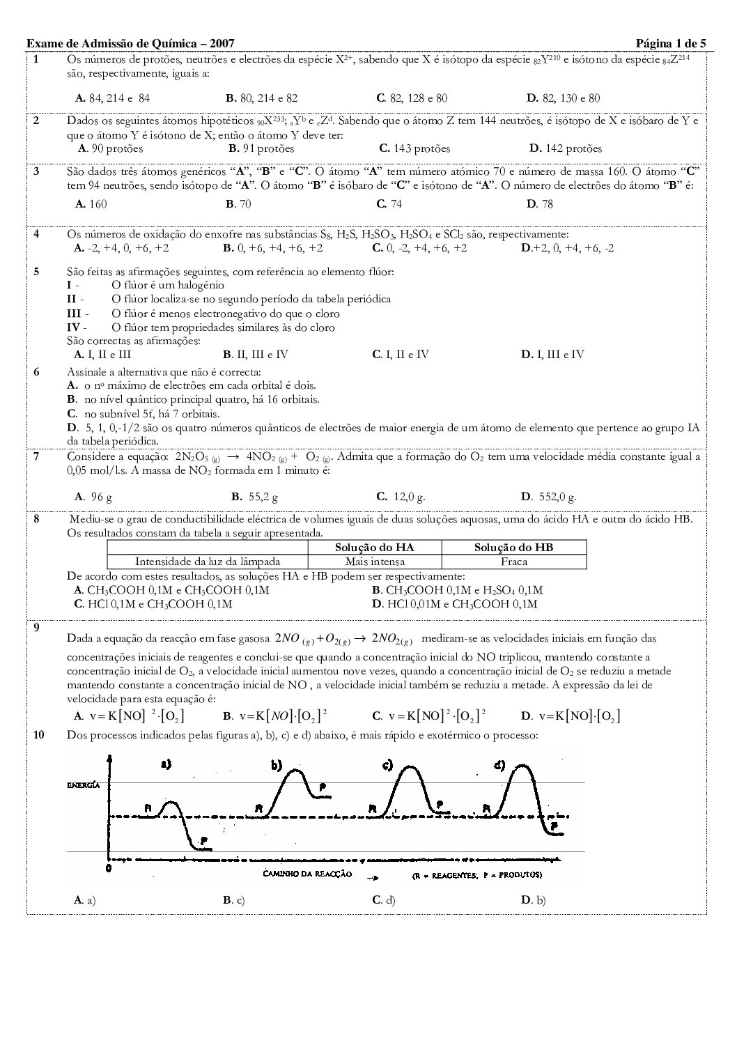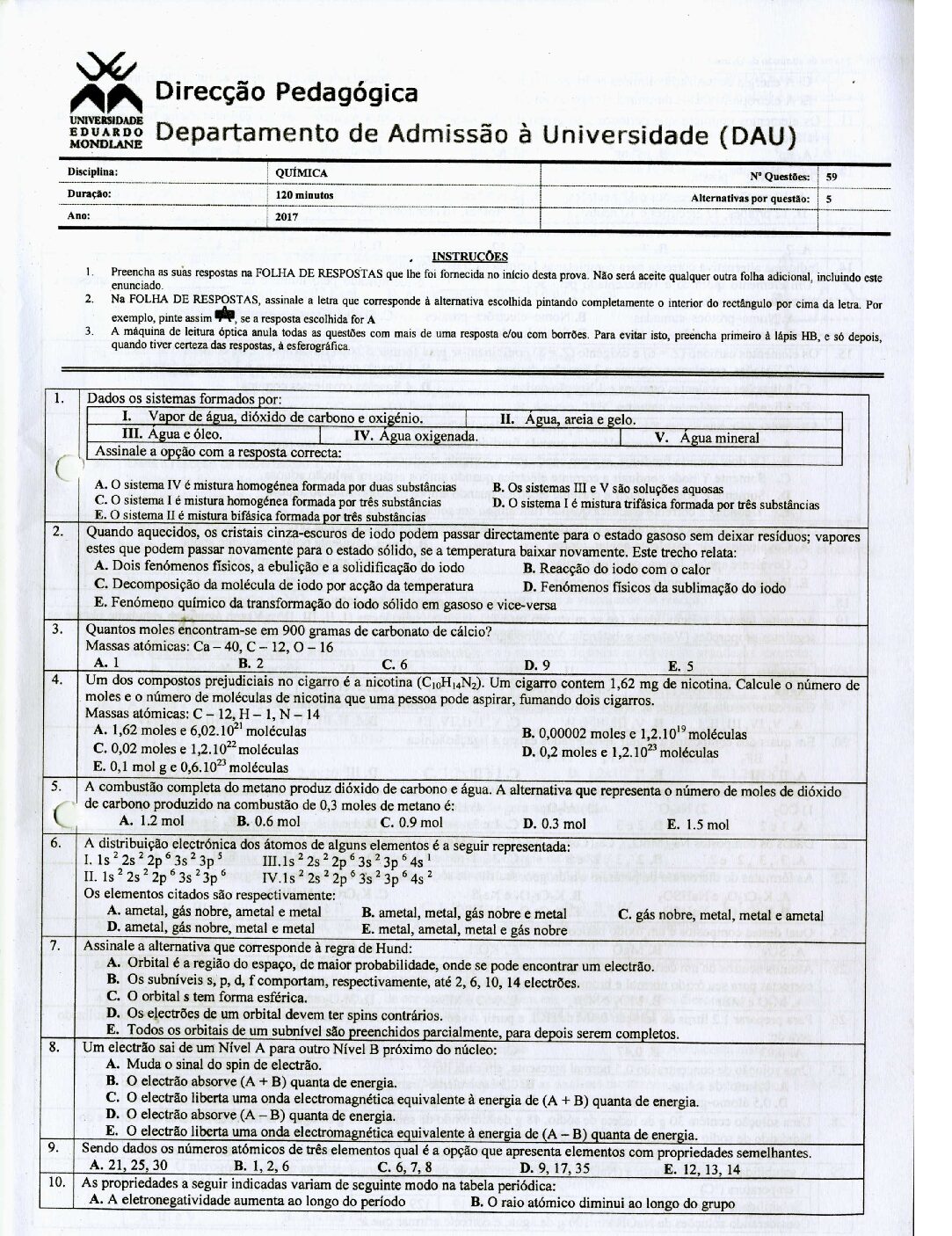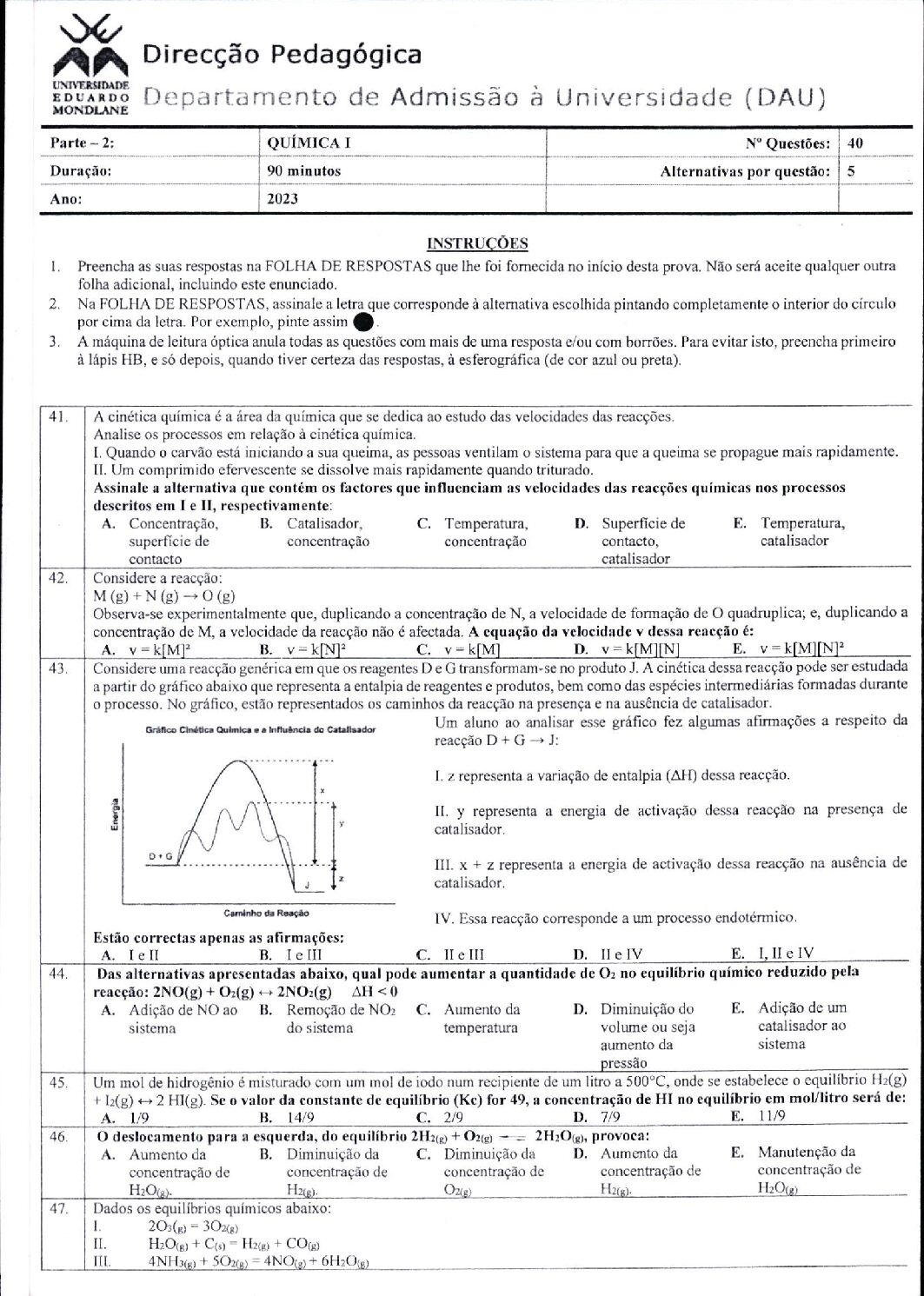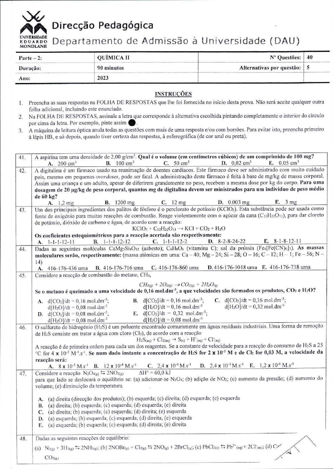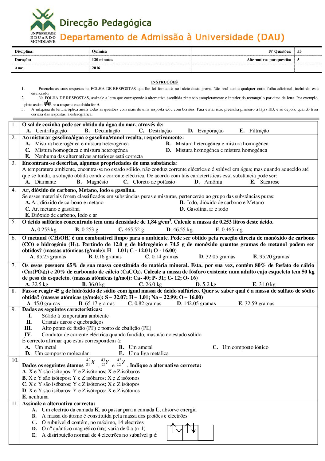 Química 2 – 2025 da UEM (Enunciado do Exame em PDF) - Baixar este documento em PDF para uso no seu ambiente académico...