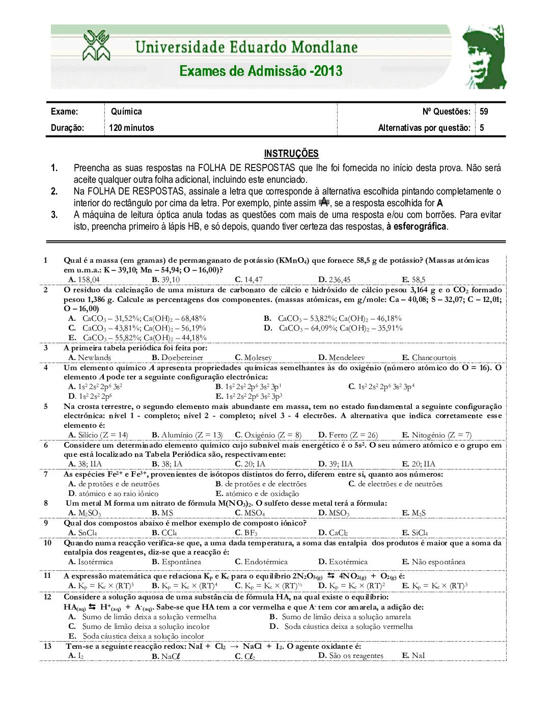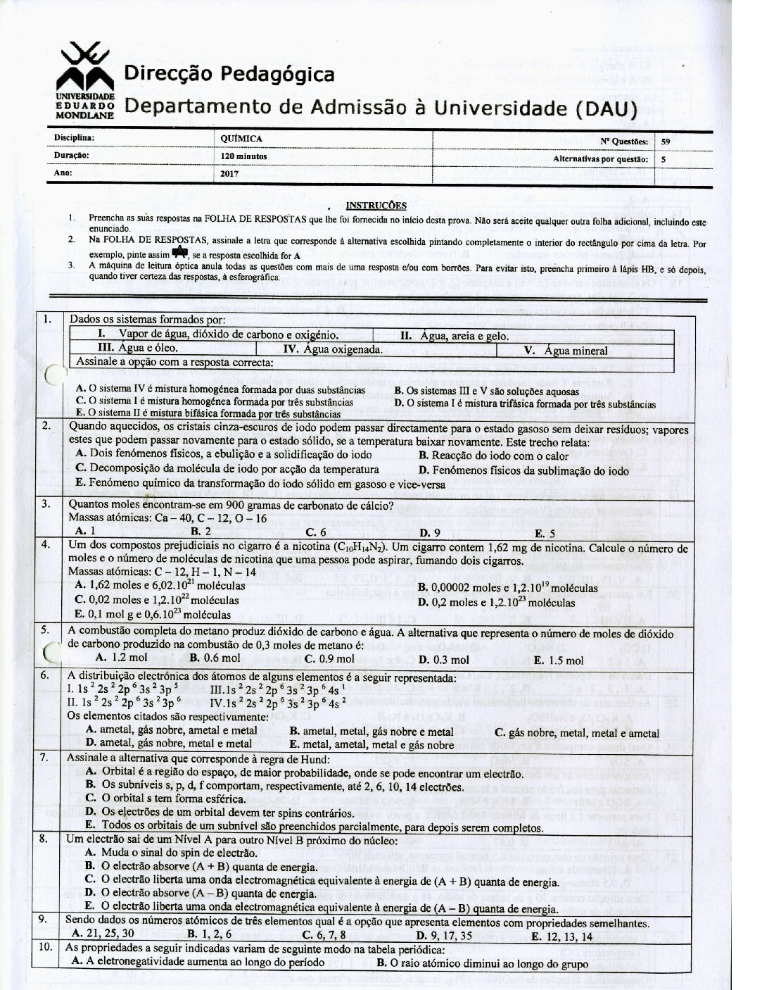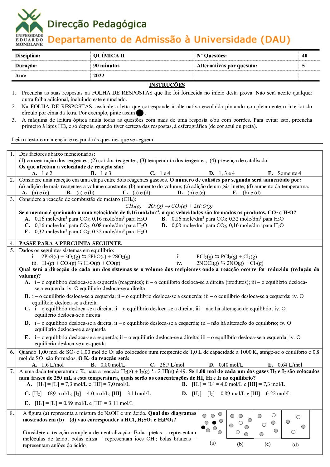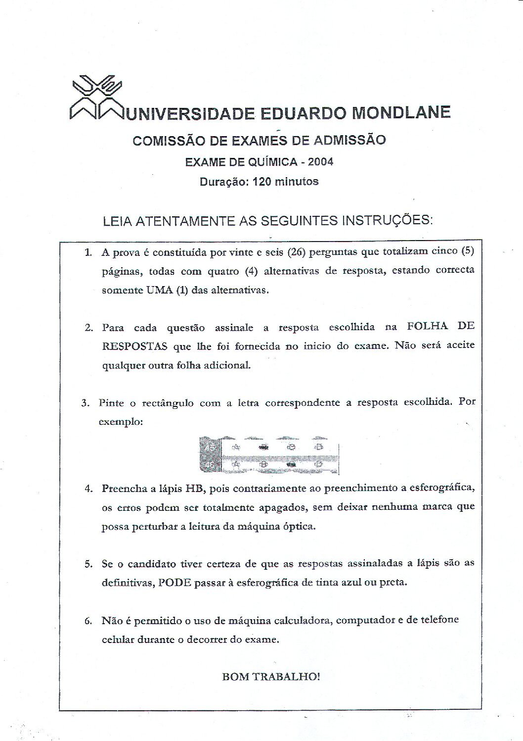 Química – 2016 da UEM (Enunciado do Exame em PDF) - Baixar este documento em PDF para uso no seu ambiente académico...