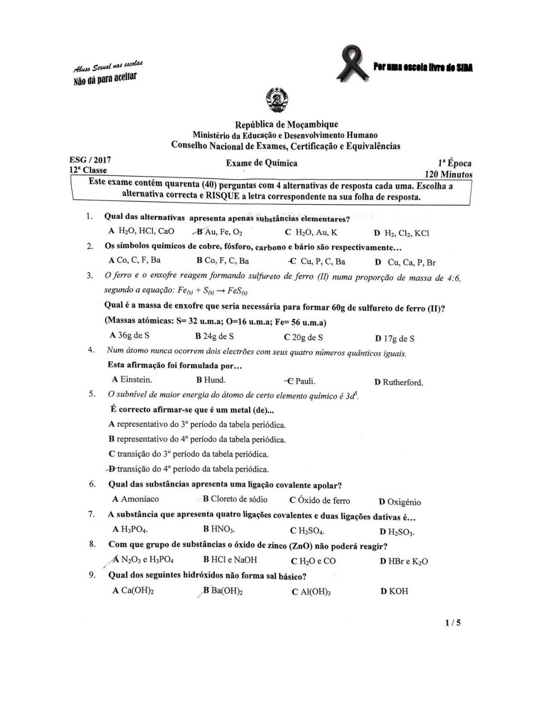 Química 2017 – 1ª Chamada da 12ª classe (Enunciado do Exame em PDF) - Baixar este documento, de forma simples, segura e grátis,...