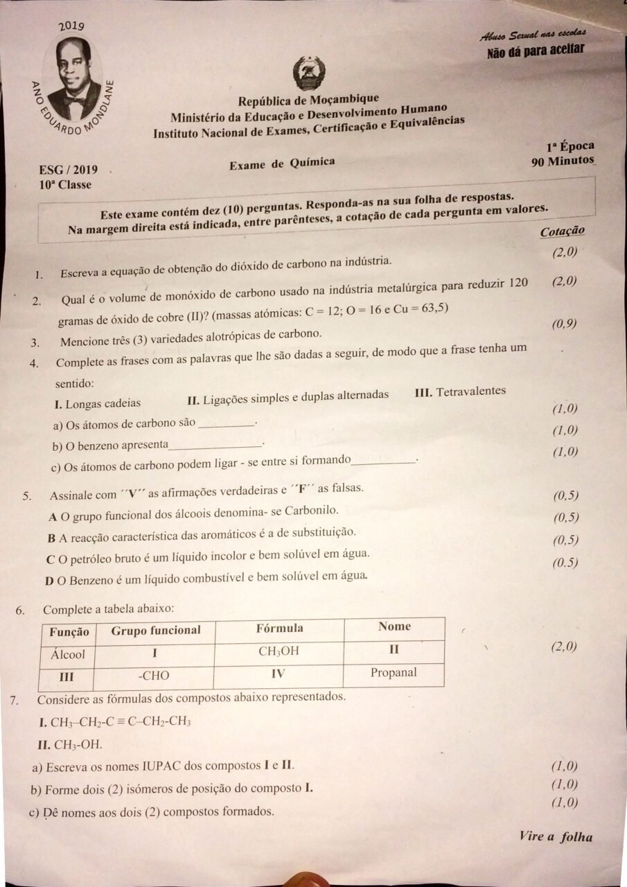 Química 2019 – 1ª Chamada da 10ª classe (Enunciado do Exame em PDF)