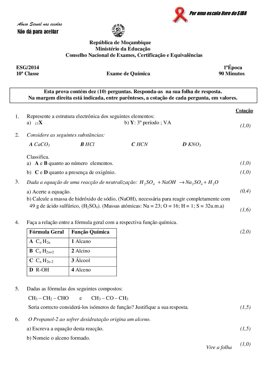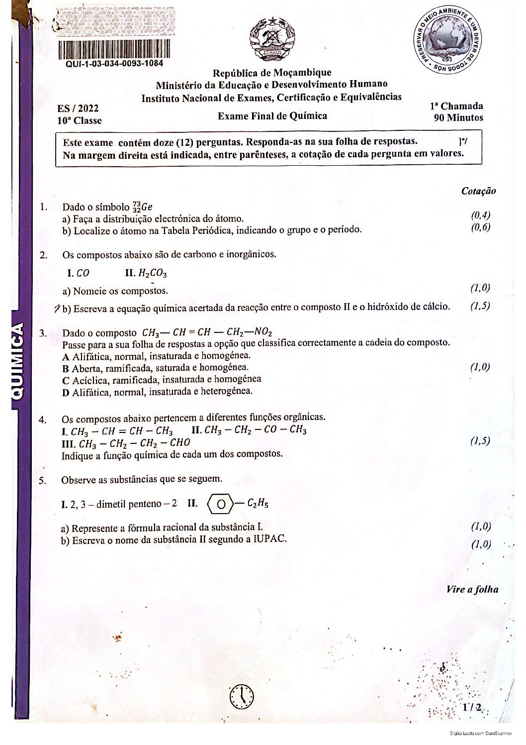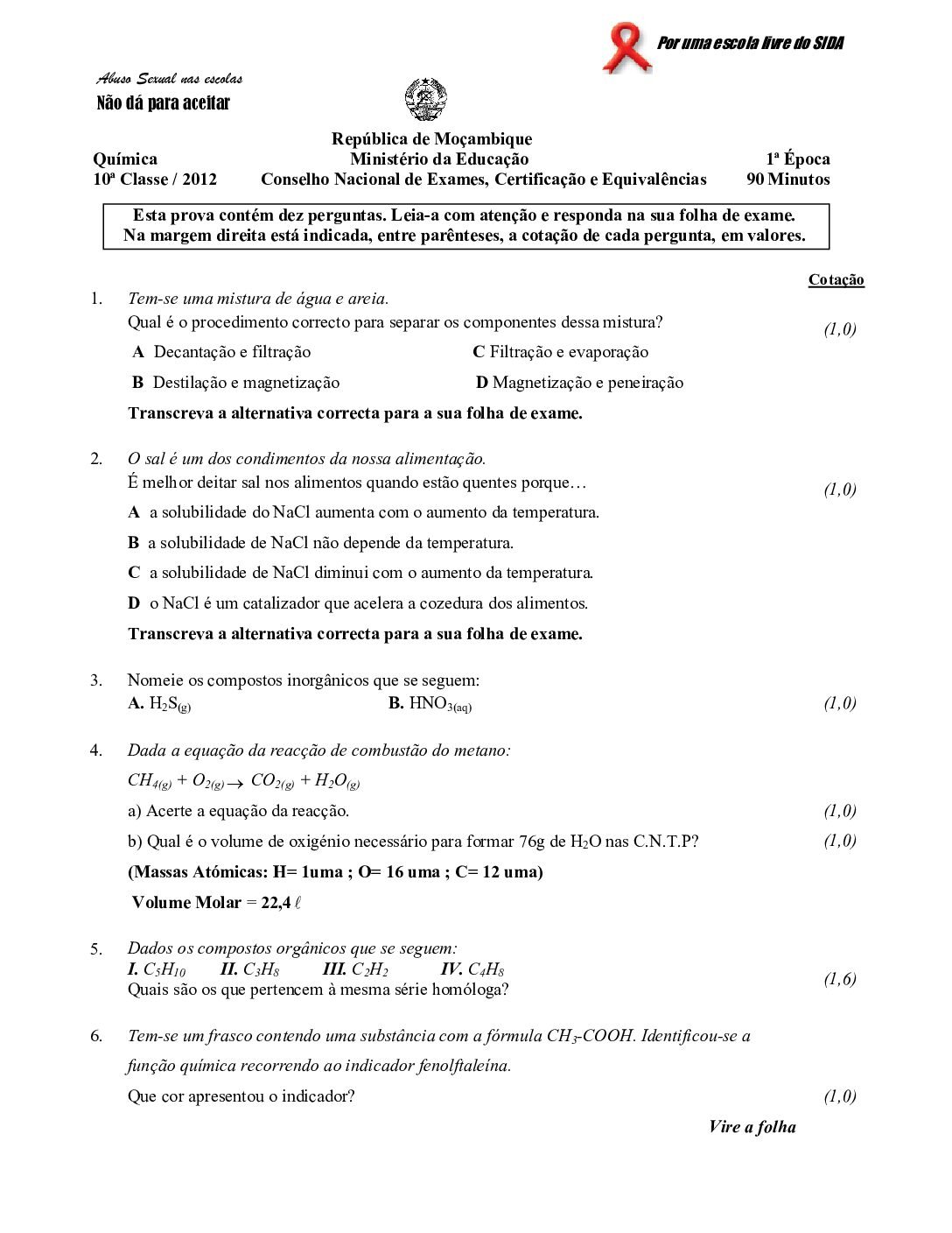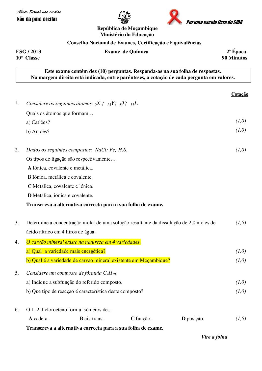 Química 2019 – 1ª Chamada da 10ª classe (Enunciado do Exame em PDF) - Baixar este documento, de forma simples, segura e grátis,...